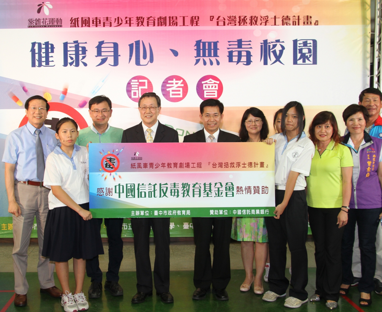 中國信託反毒教育基金會執行長張治平說,有感於近來許多年輕學子因染毒而導致家庭破碎並毒害一生,中國信託運用集團資源,於今年8月25日成立中國信託反毒教育基金會,擴大反毒教育宣導,讓反毒觀念向下扎根;基金會成立的首場活動就是和台中市政府合作,邀請紙風車劇團演出反毒劇,希望藉由生動的戲劇,建立年輕學子反毒意識。(9/17*7)