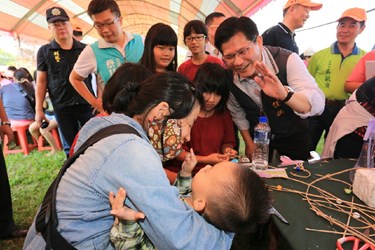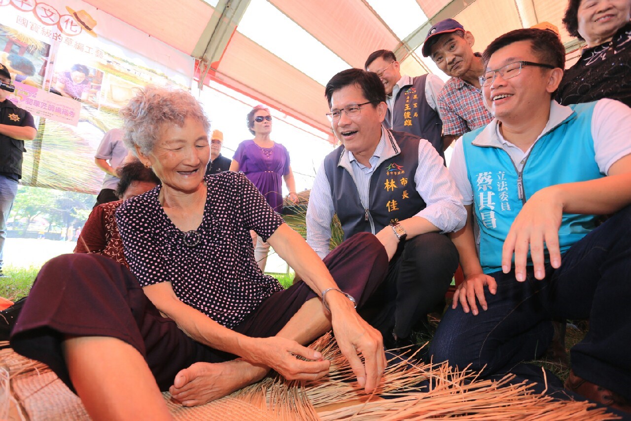 林市長在立委蔡其昌、市議員吳敏濟、大甲區長劉來旺、大甲區農會總幹事黃瑞祥及理事長羅旺等人的陪同下出席今日活動,與現場民眾及攤商親切招呼,並大啖米粉芋、學習藺草編織;看到兩位80多歲國寶級老師陳琇珠、蘇壁霞現場編織藺草的手藝,直呼兩位老師是「國寶」,並強調市府會努力協助傳承,將如此精湛的工藝技術紀錄下來。