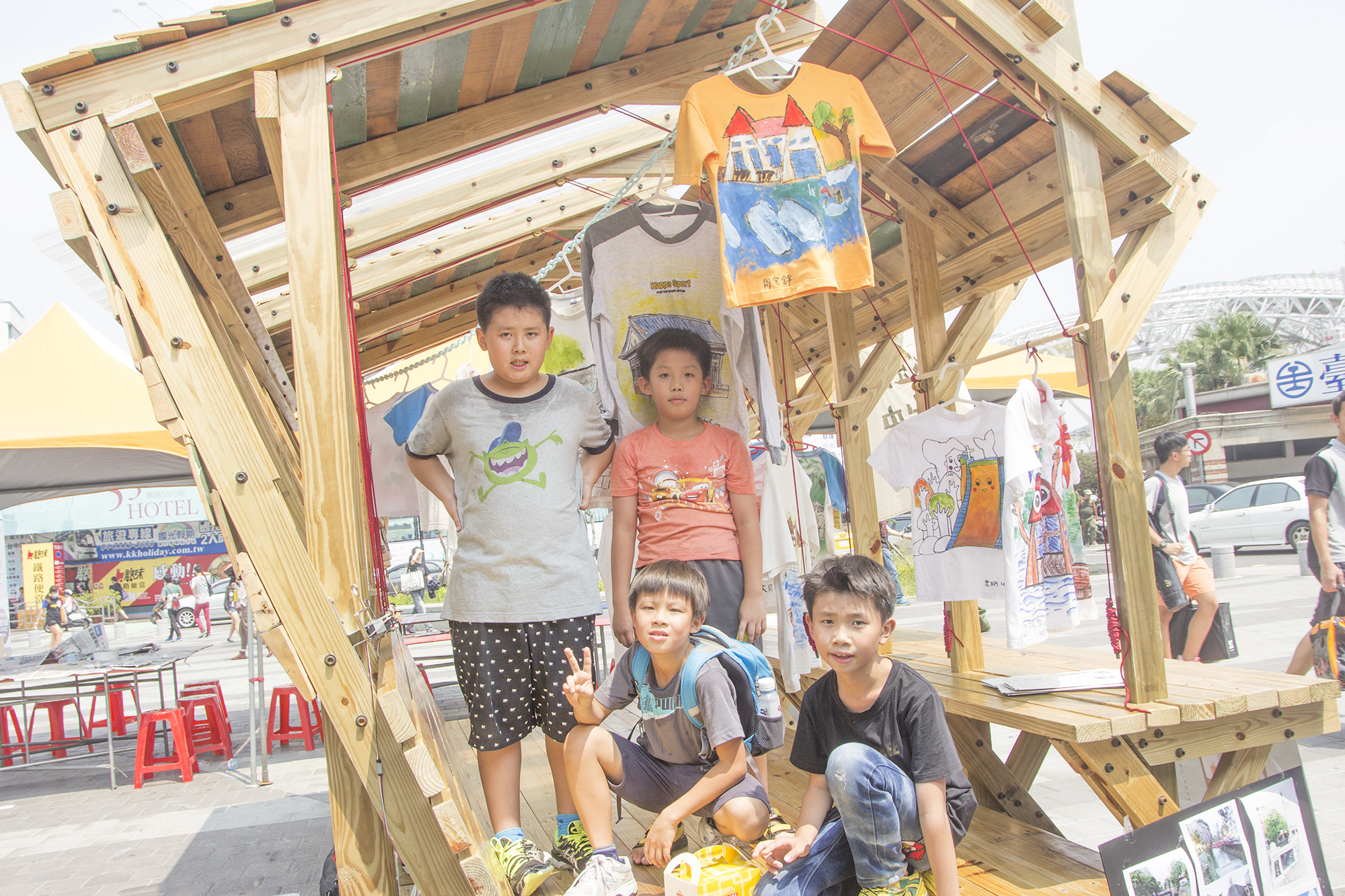 活動中學童在自己帶來的舊T-shirt上,繪製台中火車站、市役所、演武場、台中公園湖心亭、宮原眼科等文化地景,充分展現創造力,而這些完成彩繪的T-shirt,也將展示在文創作品「雙水亭」中,成為台中舊城的一景。