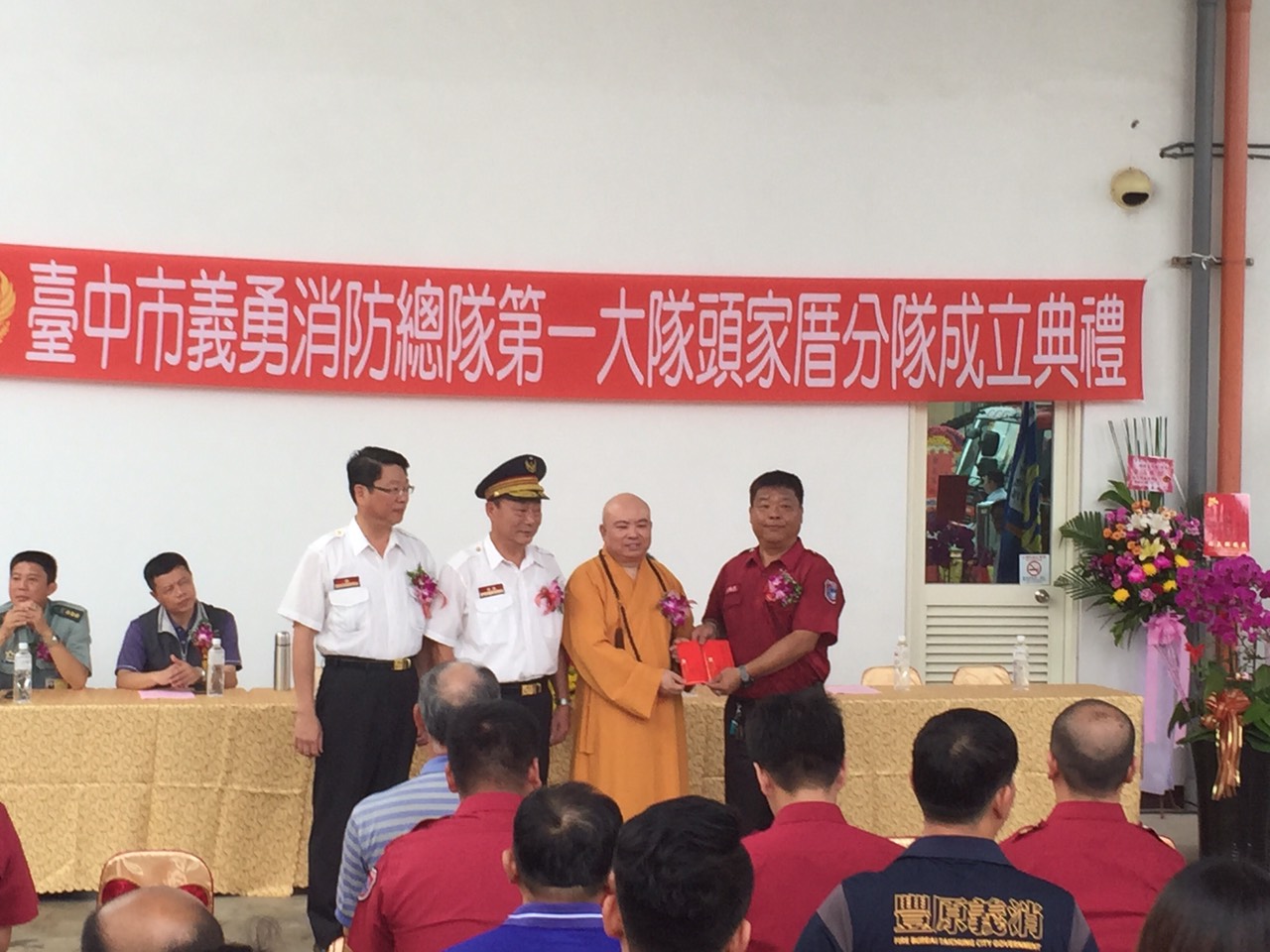 本願山彌陀講堂信願法師今天也到場捐贈創隊基金,幫助頭家厝義消分隊添購防護裝備,她希望拋磚引玉,社會各界踴躍出分心力保護家園。蕭局長等人相當感謝信願法師的愛心。