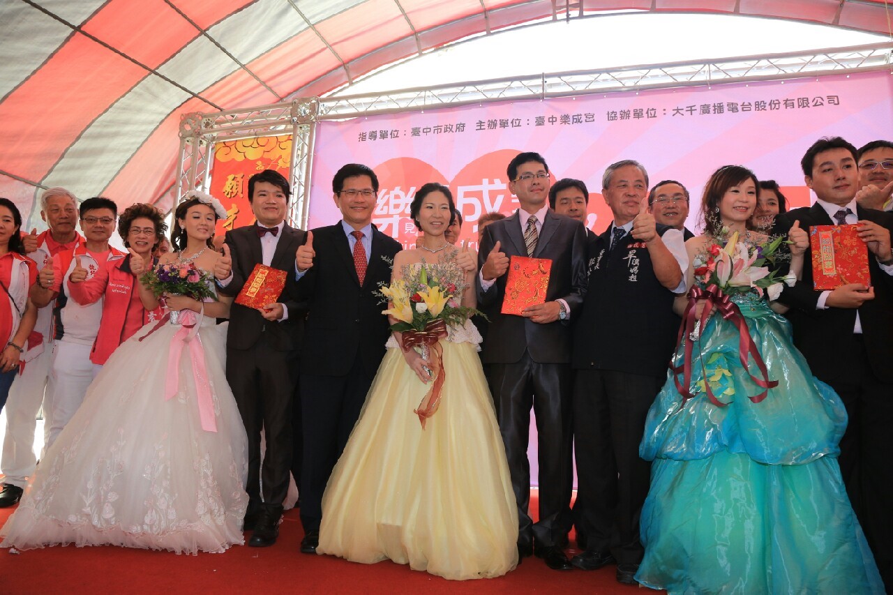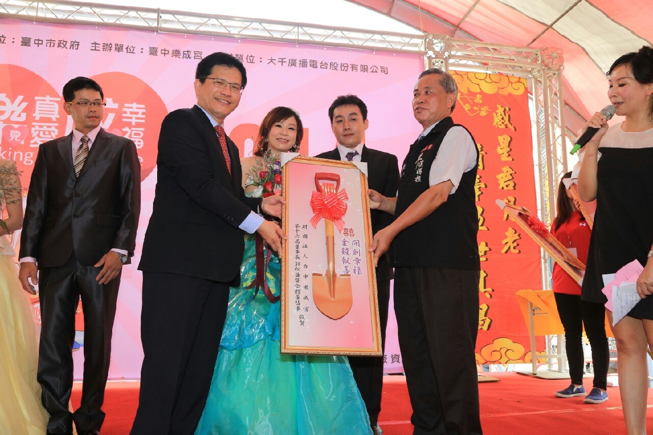 台中市樂成宮除主神媽祖外,也恭奉月老星君。為慶祝月老星君聖誕,今(26)日隆重舉行「樂見真愛 成就幸福 月老慶生締佳緣」未婚聯誼活動,吸引將近400名未婚男女參加,並有去年配對成功、即將結婚的3對準新人出席,市長林佳龍代表頒發結婚證書及「金鏟」,希望準新人早生貴子,為台中市今年新增人口突破2萬人而努力。