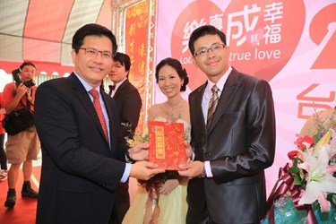 「有情人終成眷屬,有眷屬皆是情人!」林市長表示,樂成宮未婚聯誼活動提供年輕人社交機會,月下老人也相當靈驗,成功案例比例高,「樂見真愛、成就幸福」,有3組去年參加聯誼、即將結婚的準新人出席,他祝福大家「佳人才子,龍鳳成祥!」盼各位早生貴子。