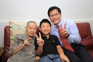 中秋前夕,林市長與蔡阿嬤家五代同堂共30多人開心地合照,現場溫馨熱鬧。身體健朗的阿嬤還俏皮地比「YA!」,她也祝福林市長身體健康,還回贈壽桃。林市長說,改天一定會再回來看阿嬤。