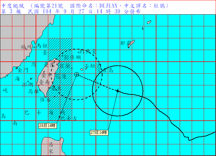 依據中央氣象局觀測資料,中颱杜鵑目前於花蓮東方海面上,逐漸接近台灣北部近海,暴風圈將威脅北部、東北部的陸地,該局已於今日上午8時30分發布海上颱風警報,可能於晚間8時左右發布陸上颱風警報;因適逢中秋節超級大潮,西部地區的沿海和低漥地區應慎防淹水。