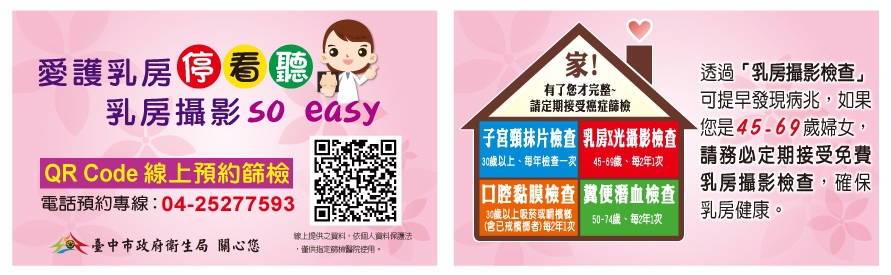 「婦女的健康,是全家人的幸福!」衛生局長徐永年呼籲,45至69歲以及40至44歲具有乳癌家族史的婦女,應定期接受乳房攝影檢查。若今年尚未接受乳房攝影的婦女,可攜帶健保卡至各區衛生所及乳房攝影醫院接受檢查,亦可透過「台中市政府衛生局乳房攝影檢查QR code」進行線上預約或洽服務專線04-2527-7593預約。(10/5*6)*衛生局