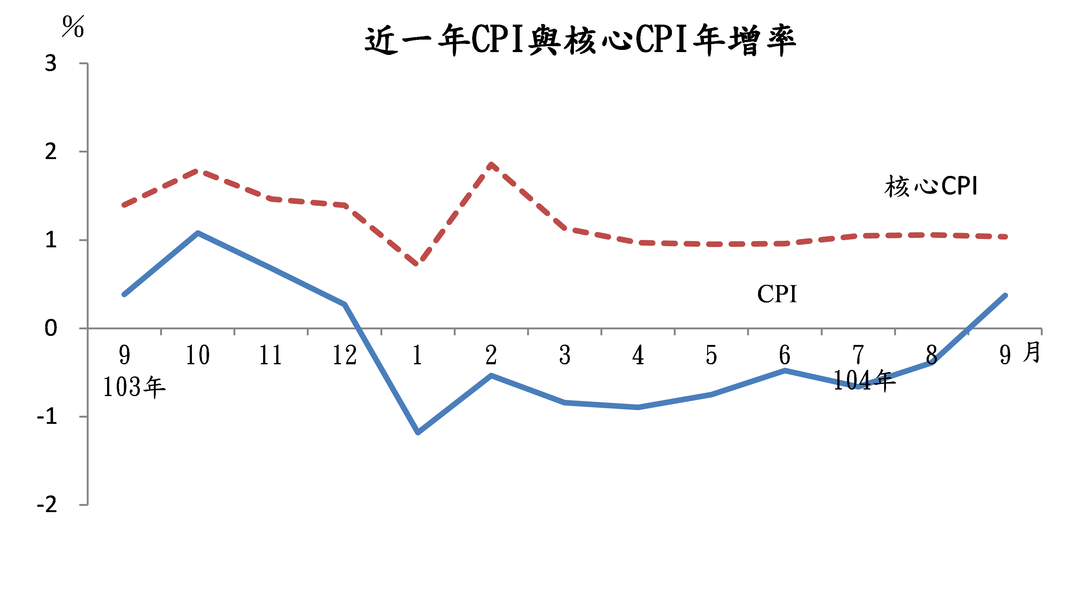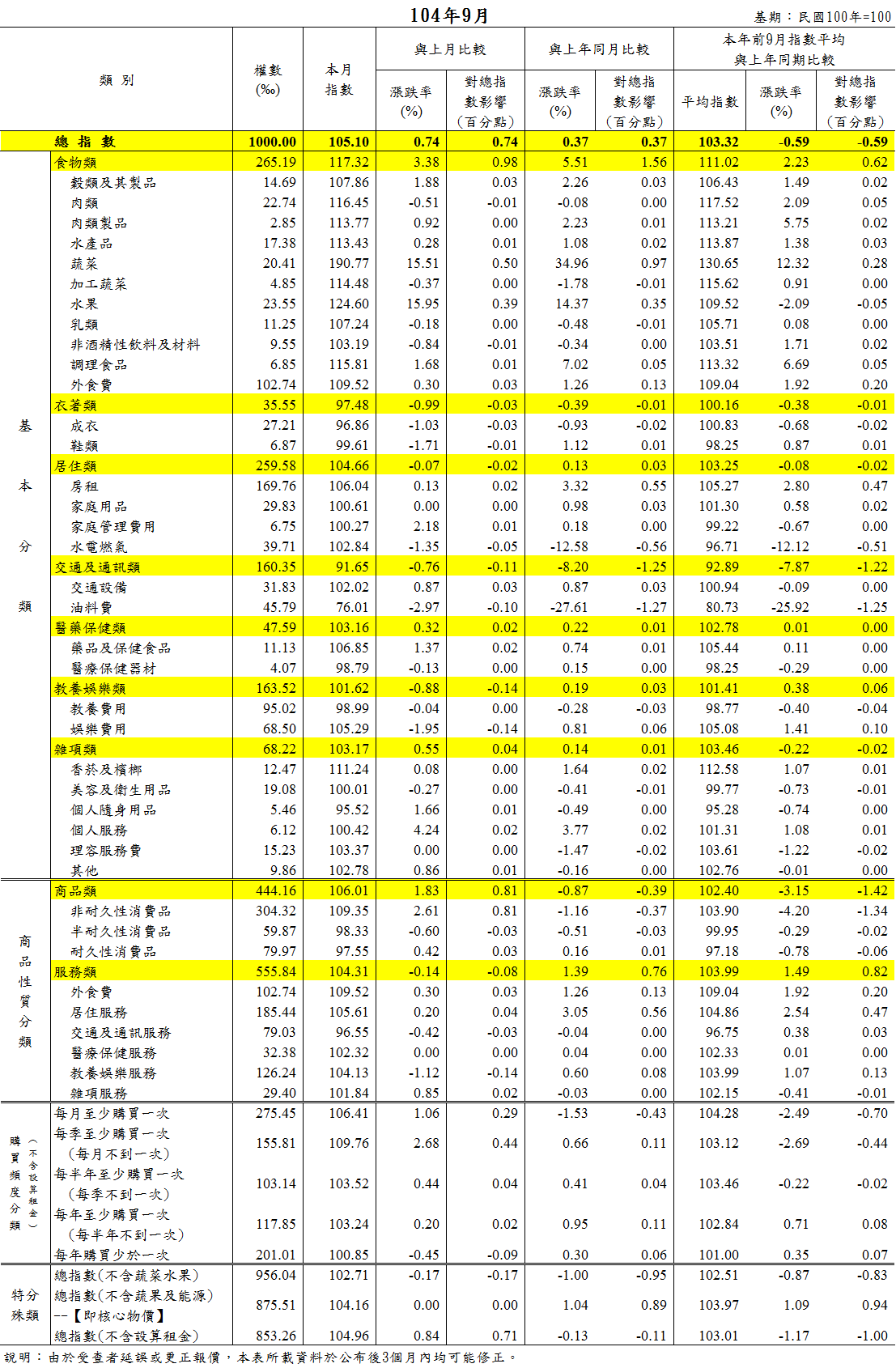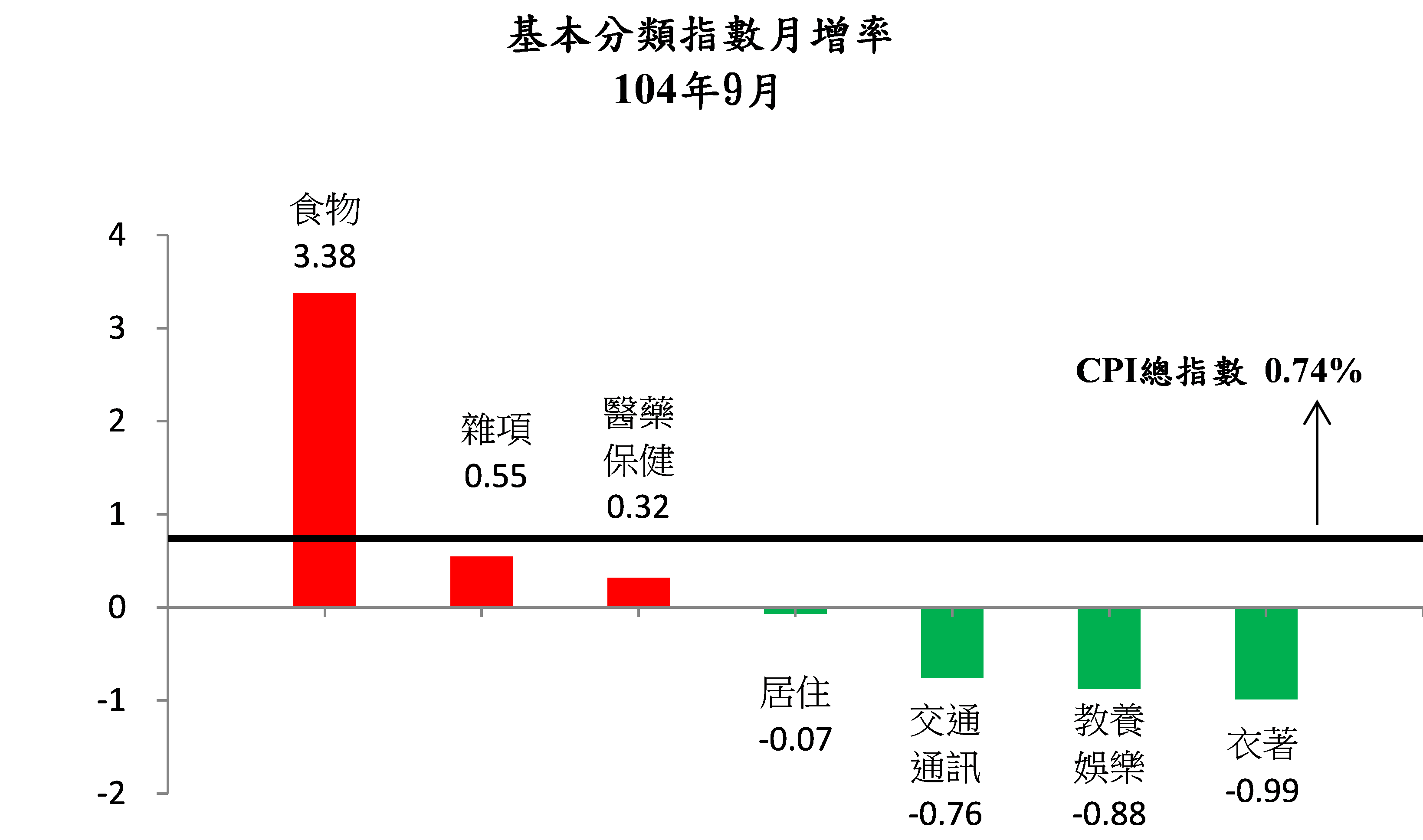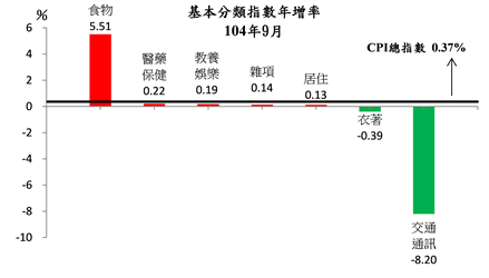 主計處指出,今年9月CPI與上月比較,上漲0.74%,觀察7大類指數變動情形,主因為蔬菜類受颱風及豪雨影響、水果類漸入產量交替,分別上漲15.51%與15.95%,導致食物類上漲3.38%;因夏季服飾折扣持續增加,以致衣著類下跌0.99%;因旅遊旺季結束,國內外旅遊團費調降,使得教養娛樂類下跌0.88%;因油料費隨國際油價調降及機票價格調降,但部分汽車優惠減少,抵銷部分跌幅,導致交通及通訊類下跌0.76%;因保母費加計中秋節禮金、部分個人隨身用品及其他(婚喪喜慶用品)優惠減少,以致雜項類上漲0.55%。
