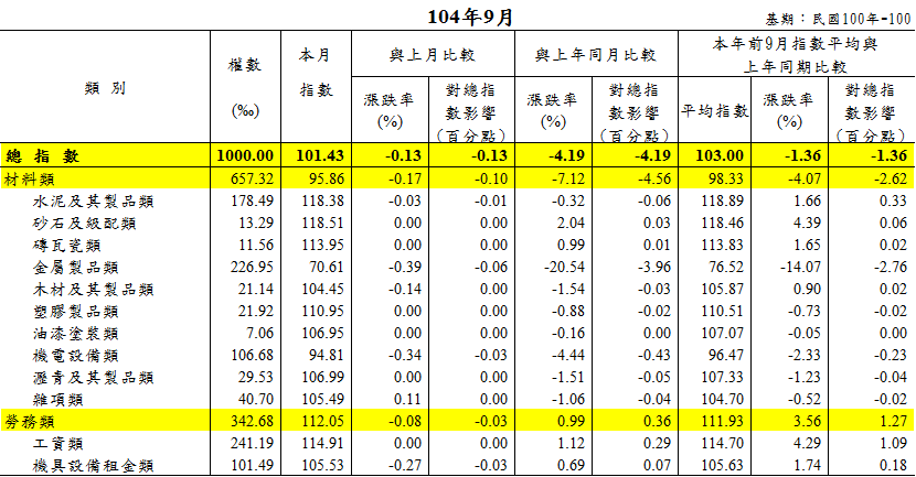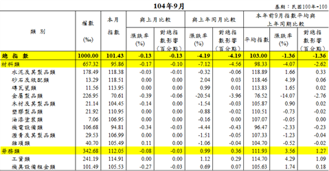主計處也指出,9月營造工程物價指數(CCI)為101.43,較上月下跌0.13%,較去年同月下跌4.19%,主因為金屬製品類受型鋼及鋼板價跌影響,但鋼筋價揚抵銷部分跌幅,下跌0.39%、機電設備類受電線電纜價跌影響,下跌0.34%,造成材料類指數下跌0.17%;因機具設備租金類下跌0.27%,使得勞務類指數下跌0.08%。