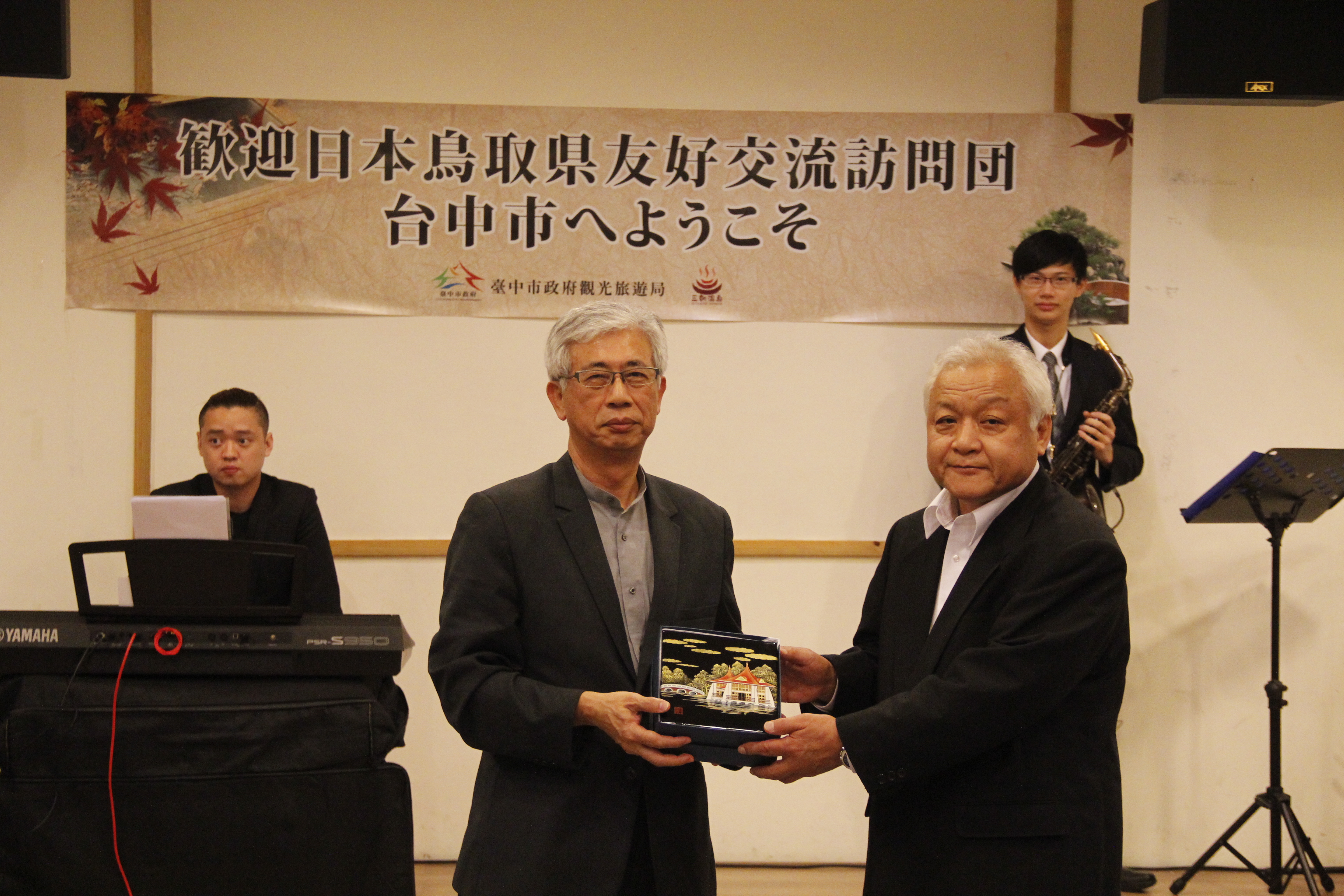 台中市溫泉觀光協會理事長羅進洲感謝觀旅局提供國際化學習的機會,希望鳥取貴賓參觀溫泉後多多給予指點,讓台中的溫泉跟國際接軌。三朝溫泉旅館協會理事長岩﨑元孝則說,常聽人稱讚日式服務如何周到,去了宮原眼科後覺得那裡的服務比日本更好,所以他們這趟來想學習台灣服務業的精神。陳局長昨日並與岩﨑理事長互贈豐原漆器、鳥取陶器等禮品,雙方相約明日再見。