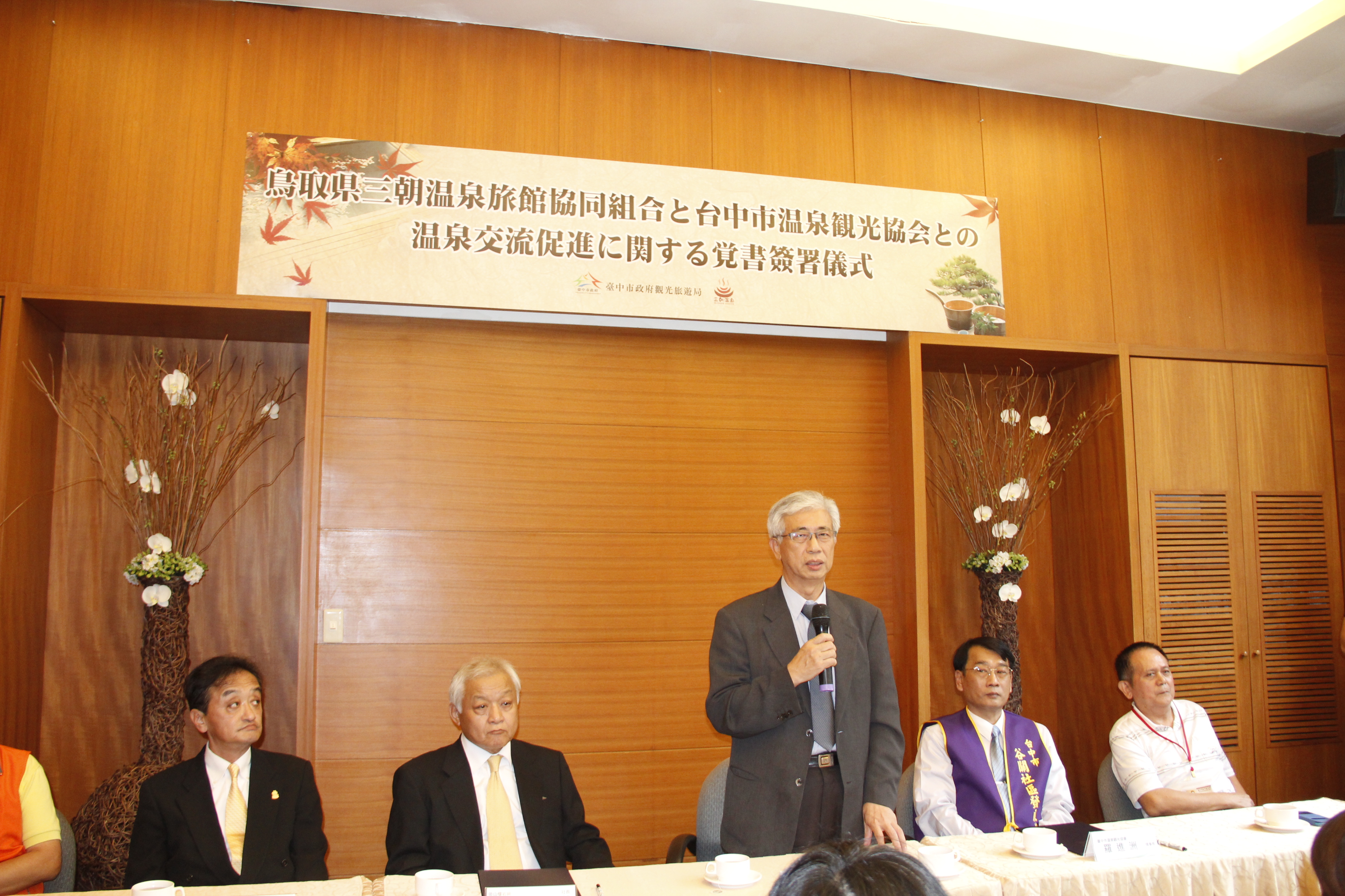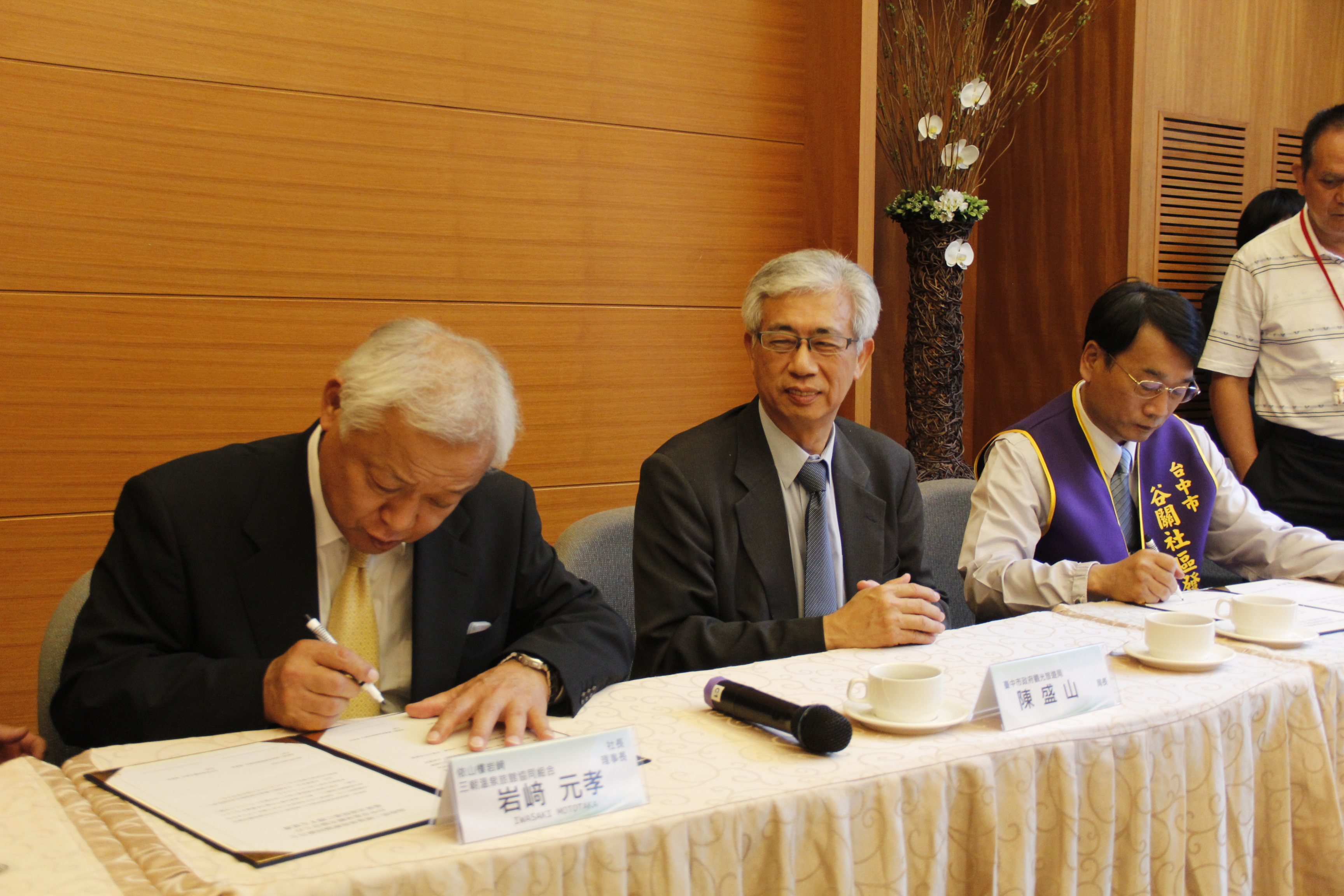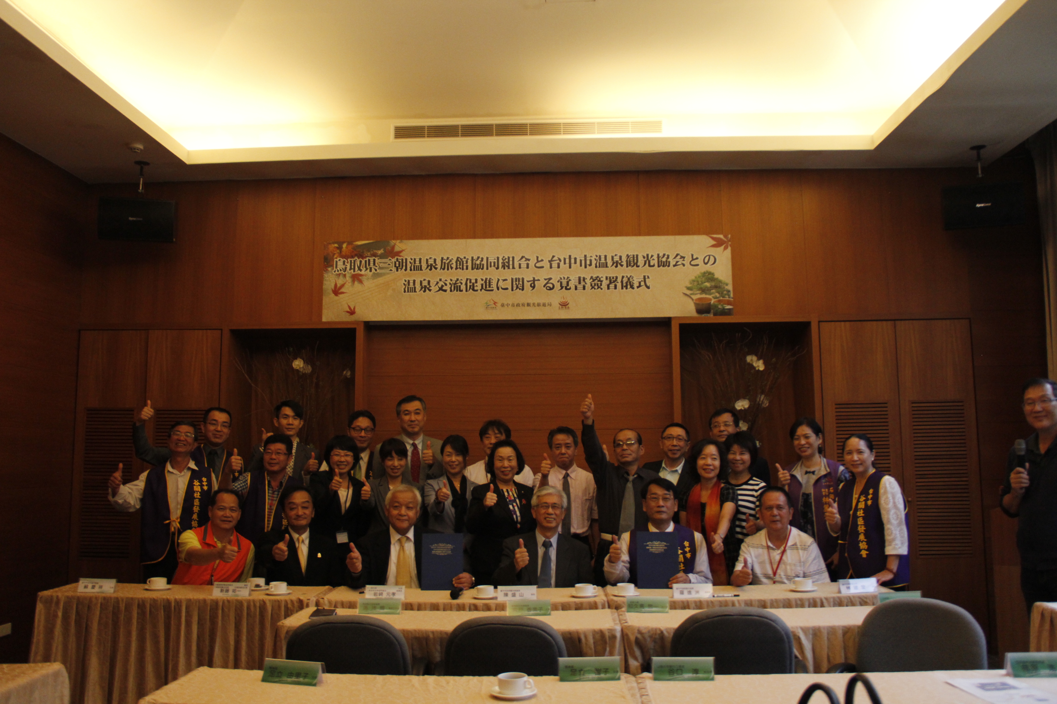 今日簽署儀式由台中市溫泉觀光協會理事長羅進洲與鳥取縣三朝溫泉旅館協會理事長岩﨑元孝為雙方代表,在觀光旅遊局長陳盛山、和平區長林建堂、和平區代表會主席蘇慶祥、鳥取縣交流推進課主事宍戸香奈子、國際交流員吳沛珊等人的見證下,於台中溫泉重鎮谷關簽署。在簽署儀式後,鳥取縣三朝溫泉旅館協會除簡報介紹三朝溫泉外,並與台中市各溫泉區的業者進行座談,將三朝溫泉業經營管理及行銷技術傾囊相授,與業者分享經驗。