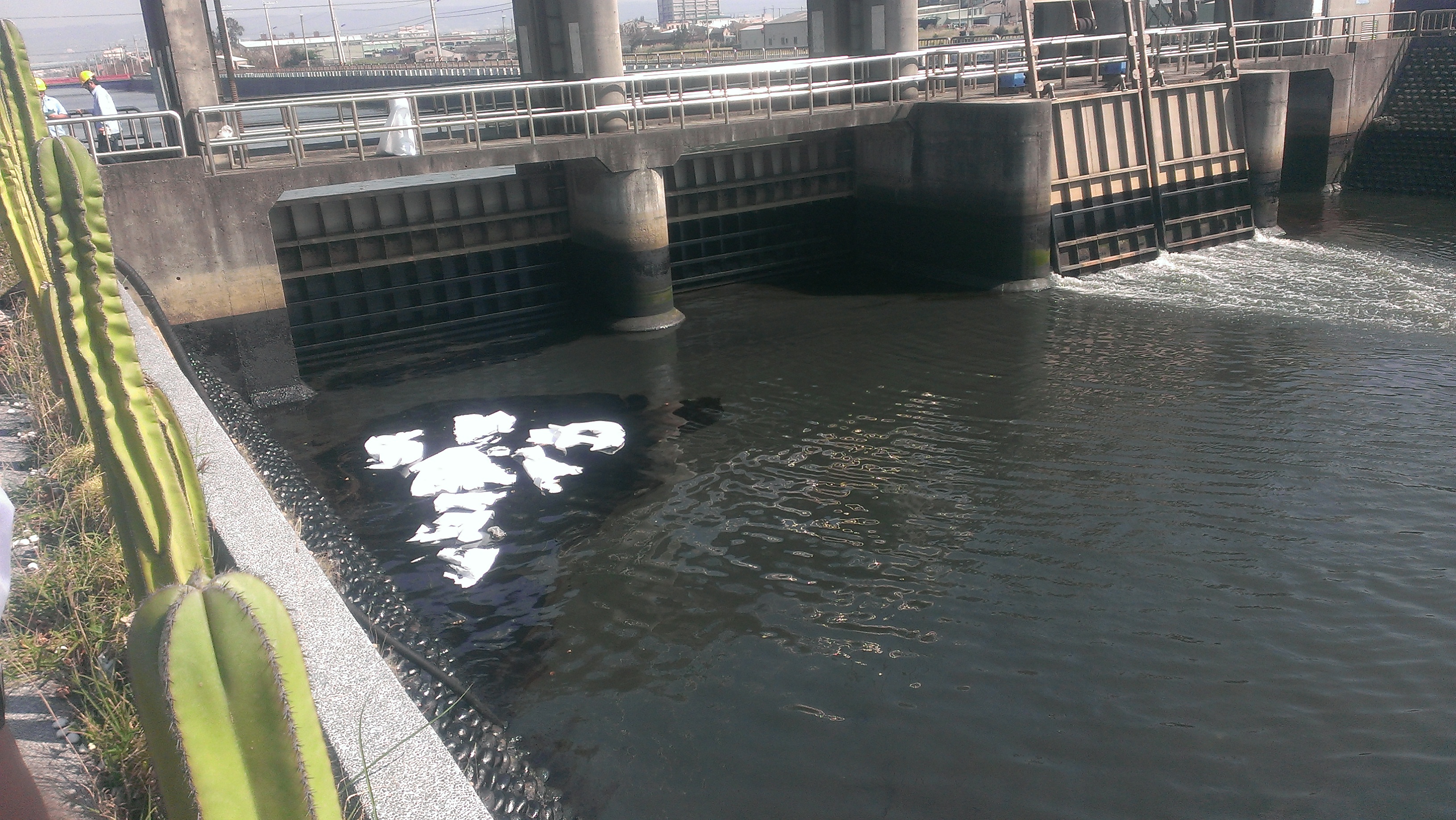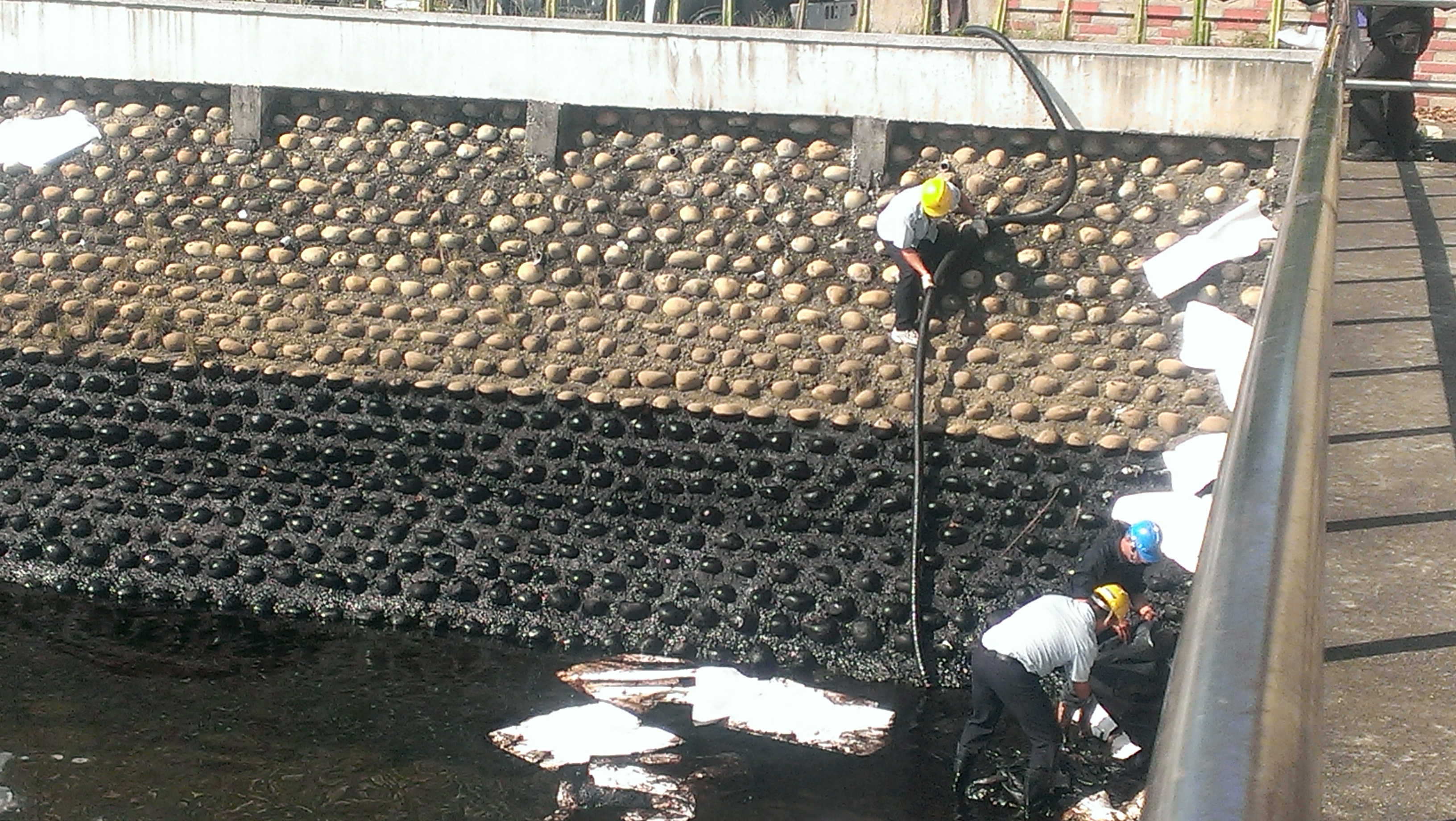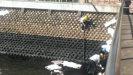 環保局於接獲中油公司通報後即派員前往勘查,發現大排受油污污染範圍在臨海路上游30公尺閘門處至下游100公尺河段內,即於油污明顯處採水樣送驗,並請中油公司在上、下游佈放2道攔油索及2道吸油索,防止油污範圍擴大,並請中油公司人員以吸油棉及吸油回收車進行河面油污吸附及抽除作業;統計昨日中油公司共出動人力50人次,於晚間9時已將河面油污清理完成,共清理污染廢棄物約350公斤,另上、下游端吸油索則持續佈設至岸際油污全部清理完成才會撤除。