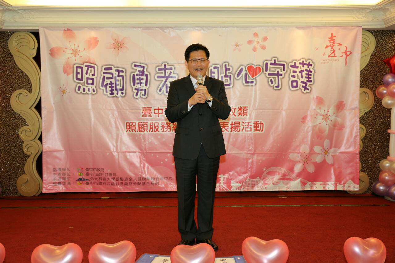 台中市政府今(17)日在舉行「104年社政類照顧服務績優人員表揚大會」,由市長林佳龍頒獎表揚60位表現績優的照顧服務員及督導員。他表示,照顧服務是一項非常辛苦的工作,感謝照服員愛心、細心、耐心地服務失能長輩及身心障礙者,讓家屬減輕照顧壓力與負荷。