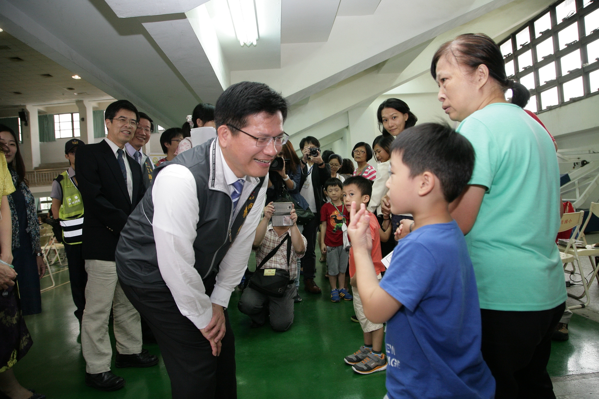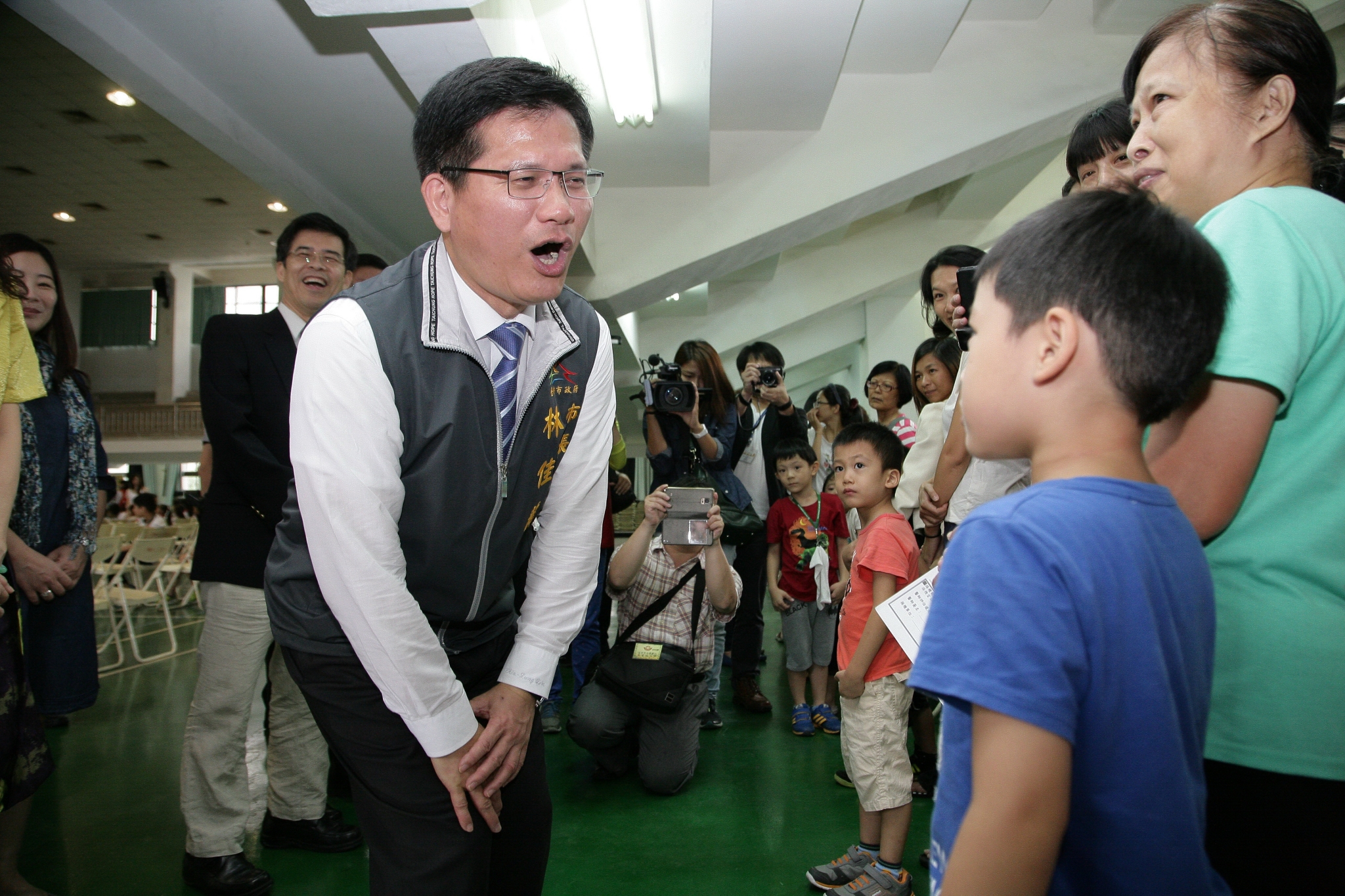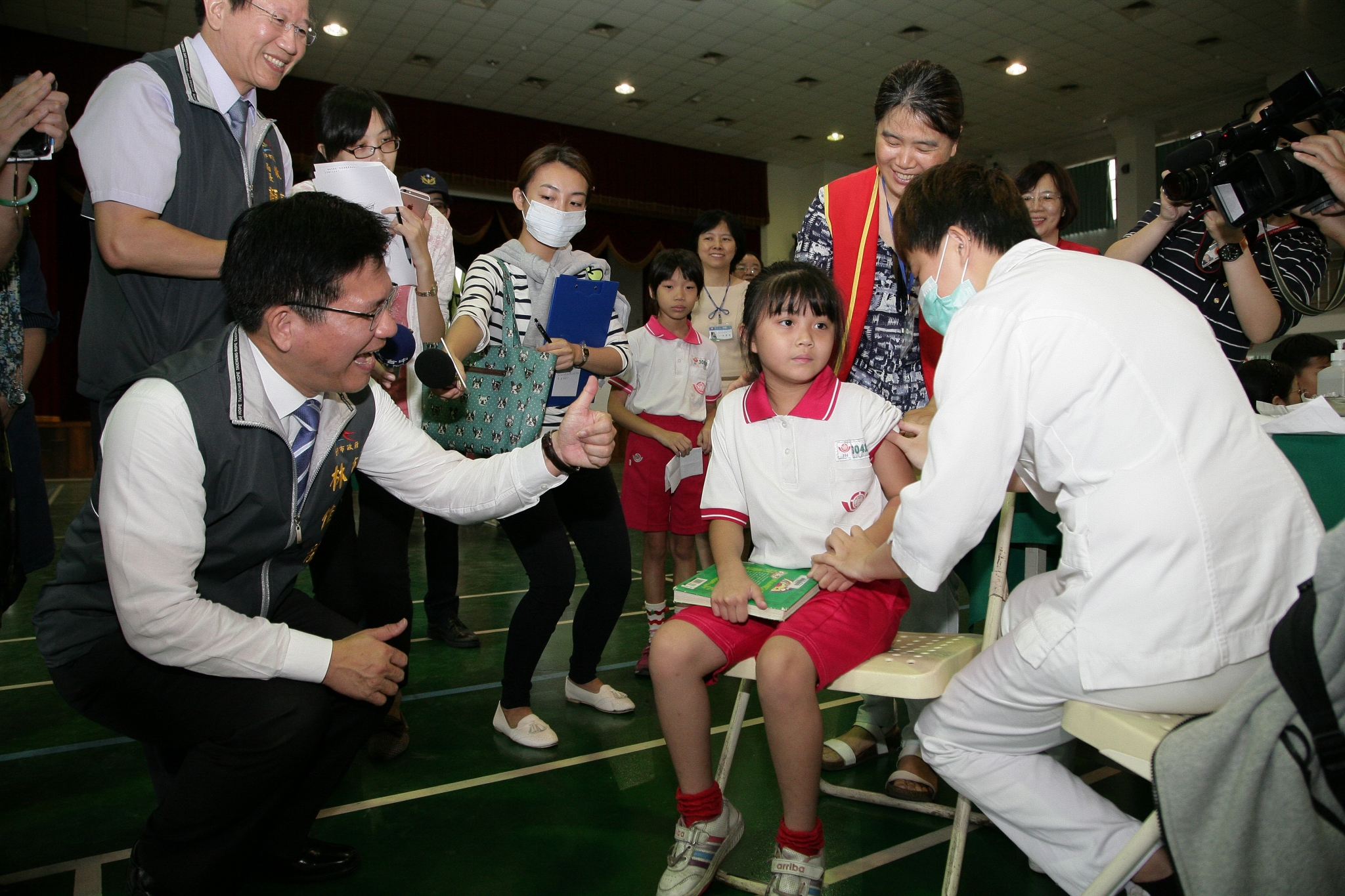 市長林佳龍今(22)日在衛生局長徐永年及教育局長顏慶祥陪同下,前往西區大勇國小關心校園集體接種情形。現場規劃初步量測學童體溫、醫師問診確認身體狀況、疫苗注射及注射後休息等四動線。現場學童依序排隊注射,有些學童緊張不已,林市長關心並鼓勵他們不要怕,放輕鬆就不會痛;也有學童主動告訴市長,他不怕打針,看醫生也不會哭。