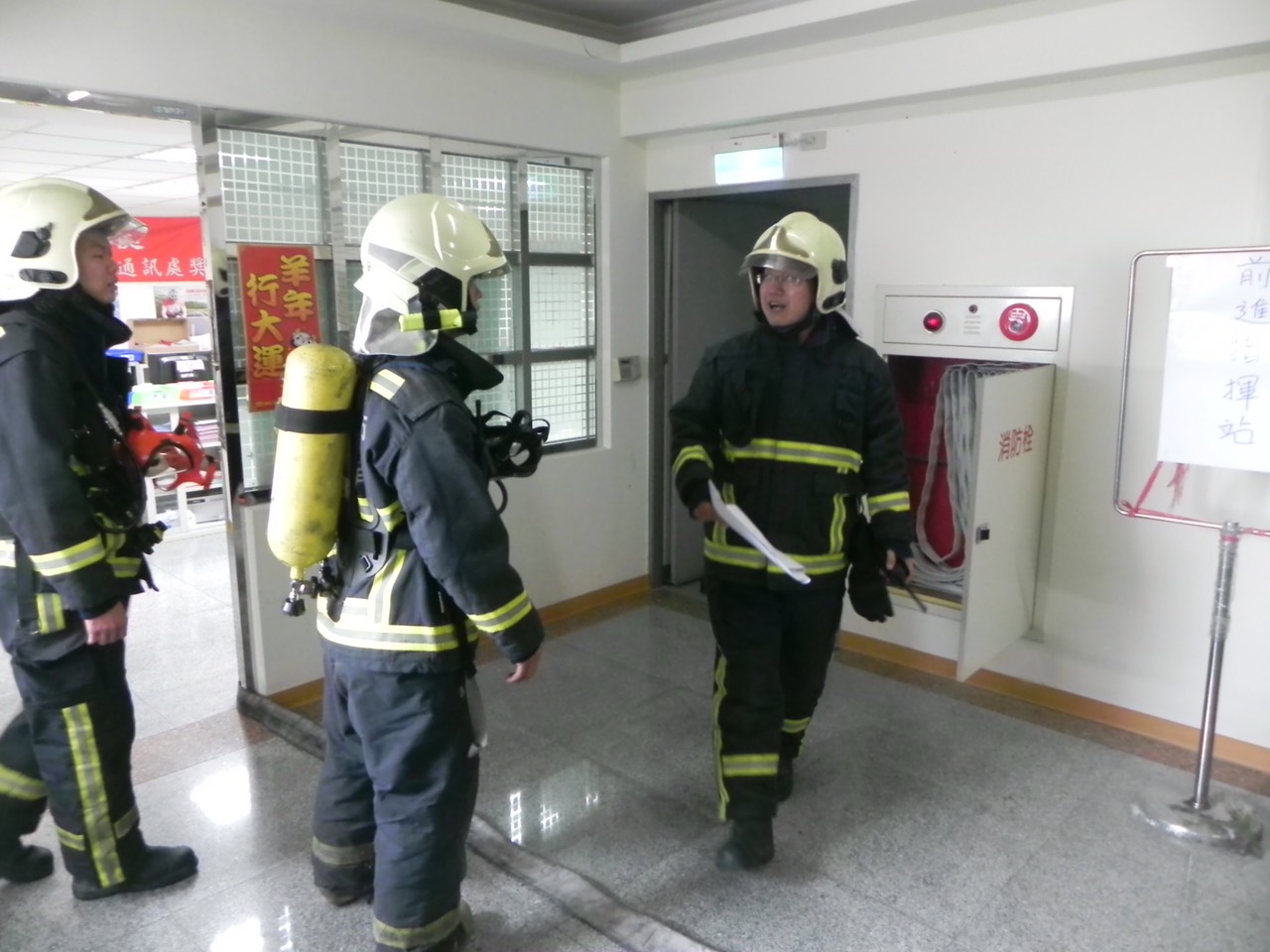此次演練項目包括消防車輛佈署、前進指揮站人員裝備器材管制站的成立、救災人員安全管制、消防水源的掌握及選擇、人命救助及搜索、雲梯車升梯操作防護作業及安全回報機制、消防人員因其他因素受困的求救及救援、緊急升降梯應用。(10/22*8)*消防局