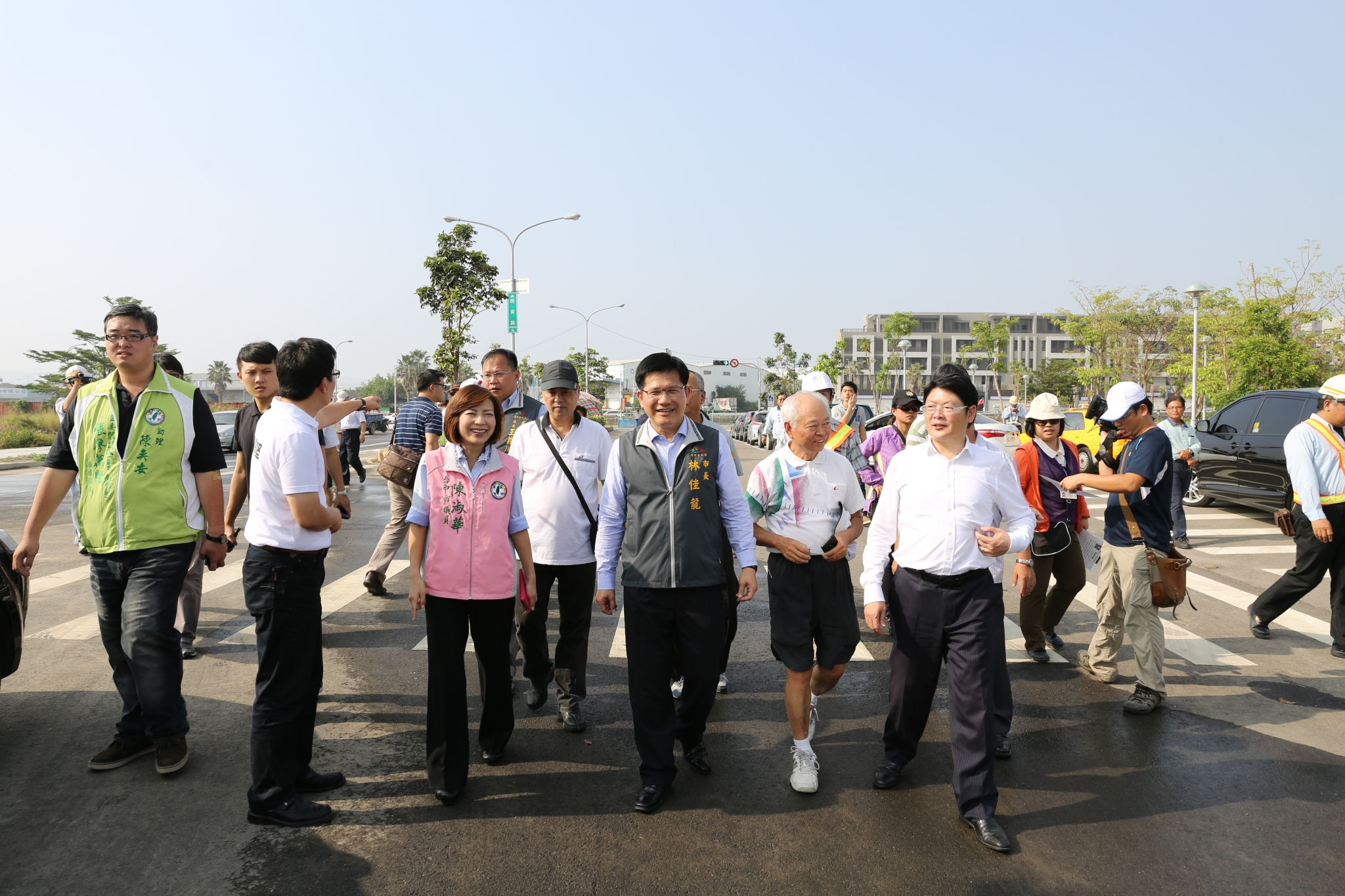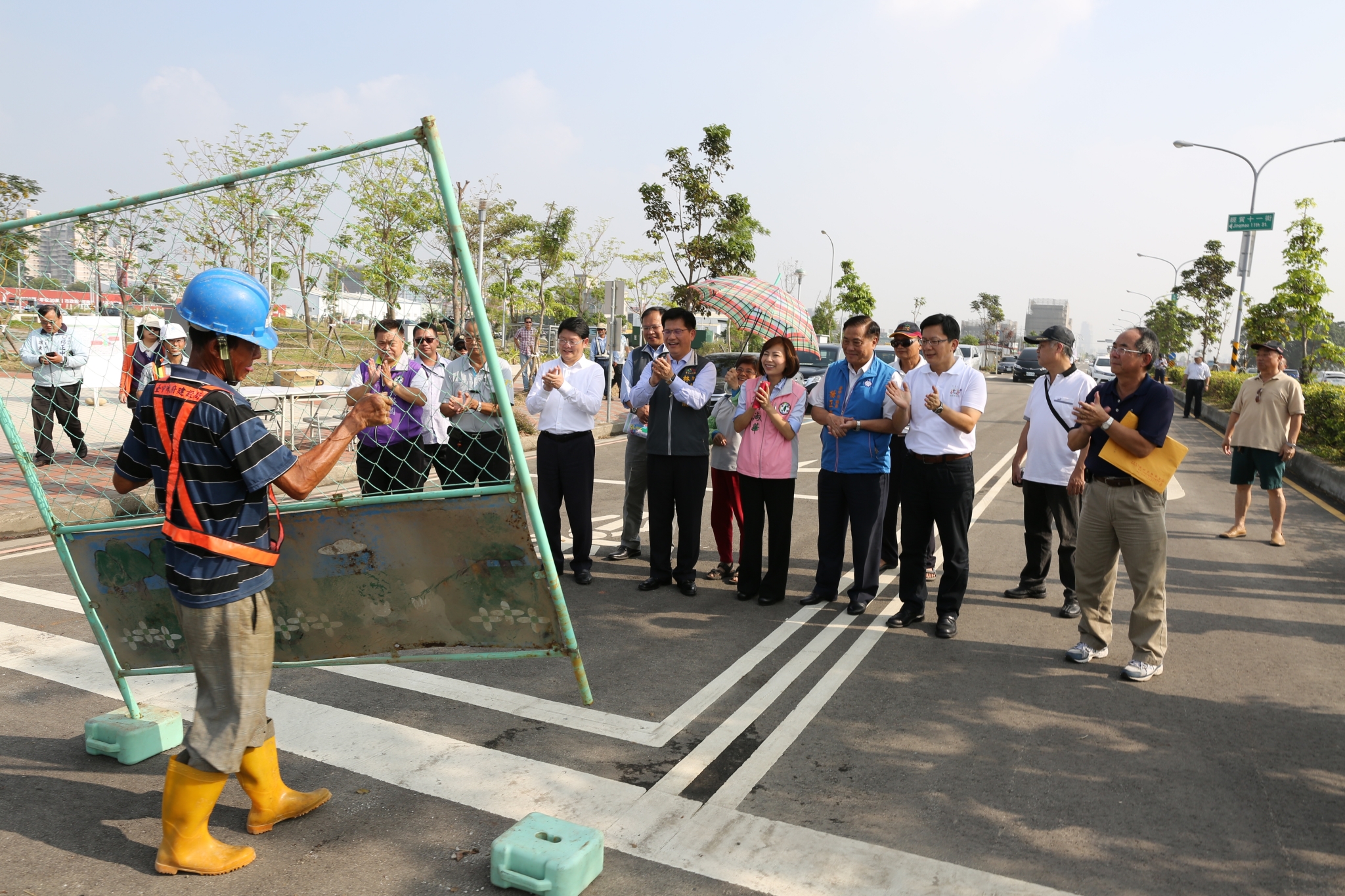 今日林市長、市議員張廖萬堅、楊正中、陳淑華及地方代表共同出席通車典禮,撤除工程籬藩,大家步行通過道路,見證經貿路雙向車道開放通車的一刻。