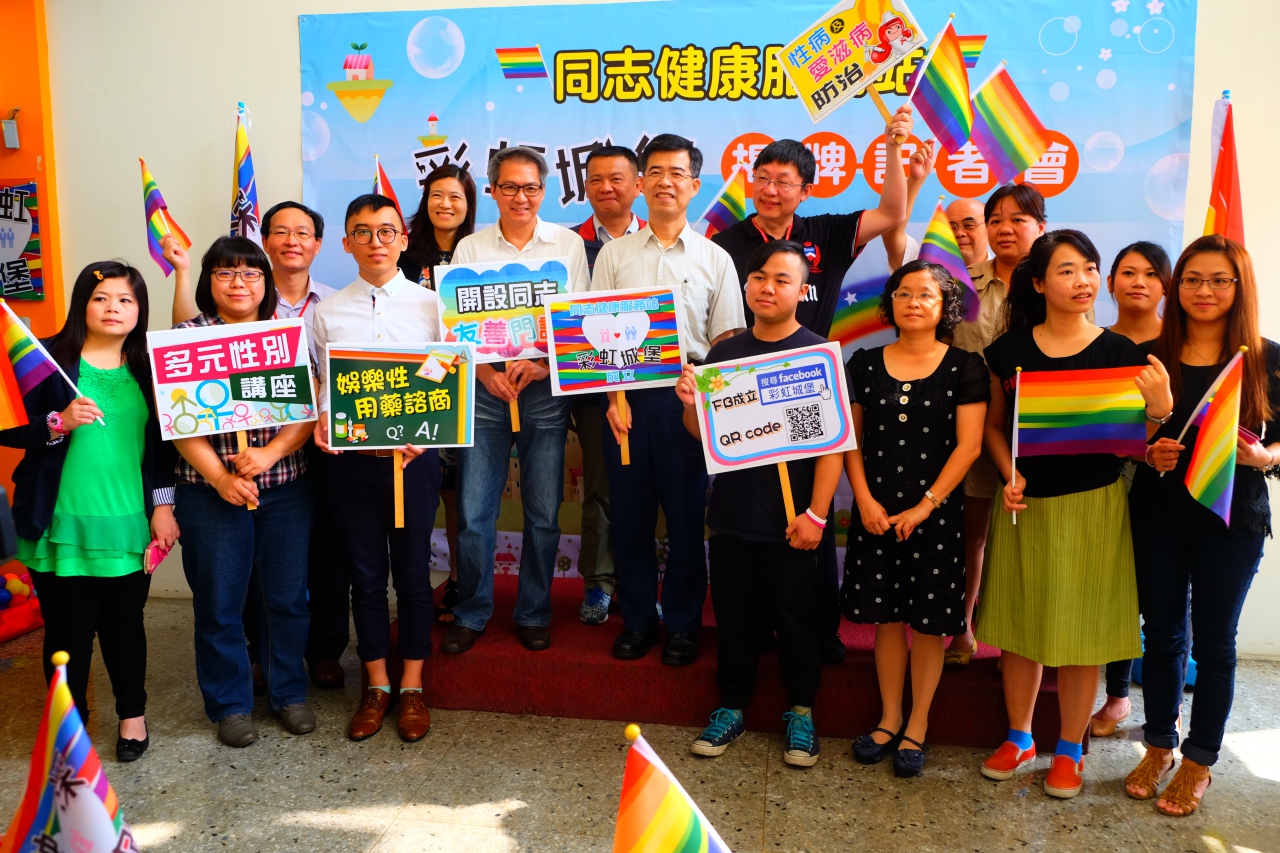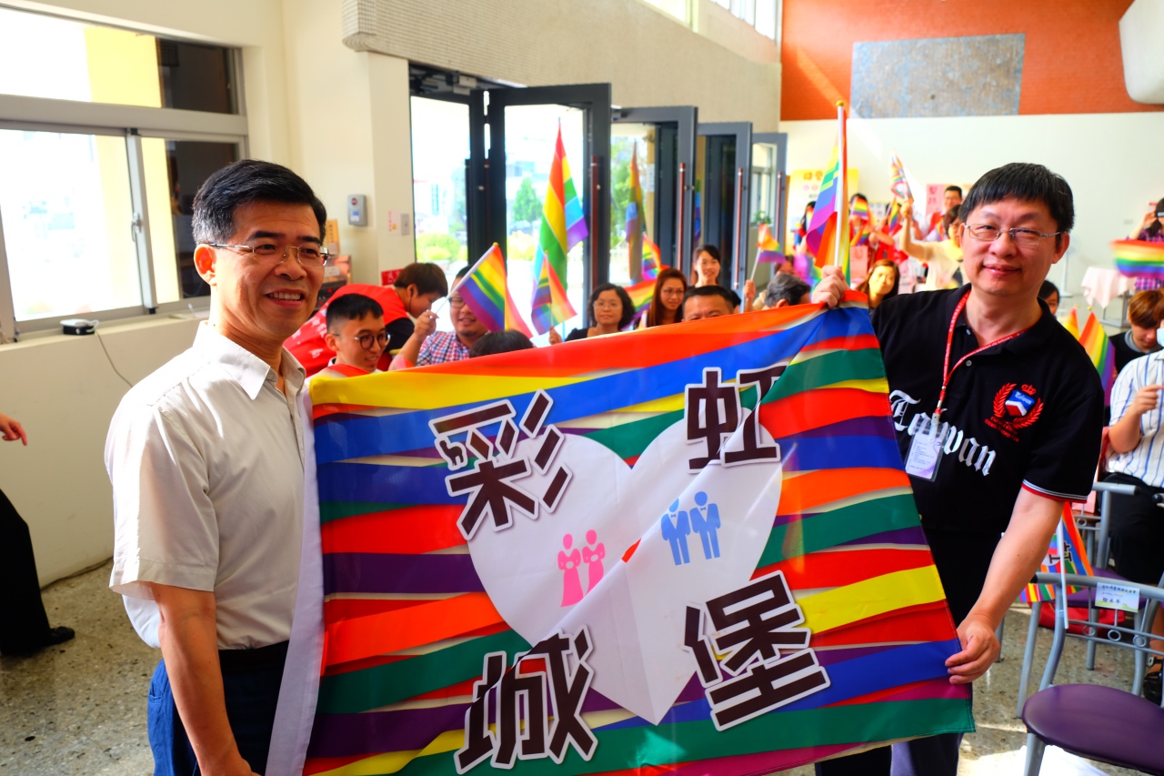 現場也由行政院衛福部疾管署代表授旗給台中市政府衛生局,象徵服務多元性別族群任務的傳遞,並邀請NGO團體現場指導及分享經營甘苦談。衛生局長徐永年表示,彩虹城堡的設置,是為了深入社區,提供多元性別的諮詢服務。