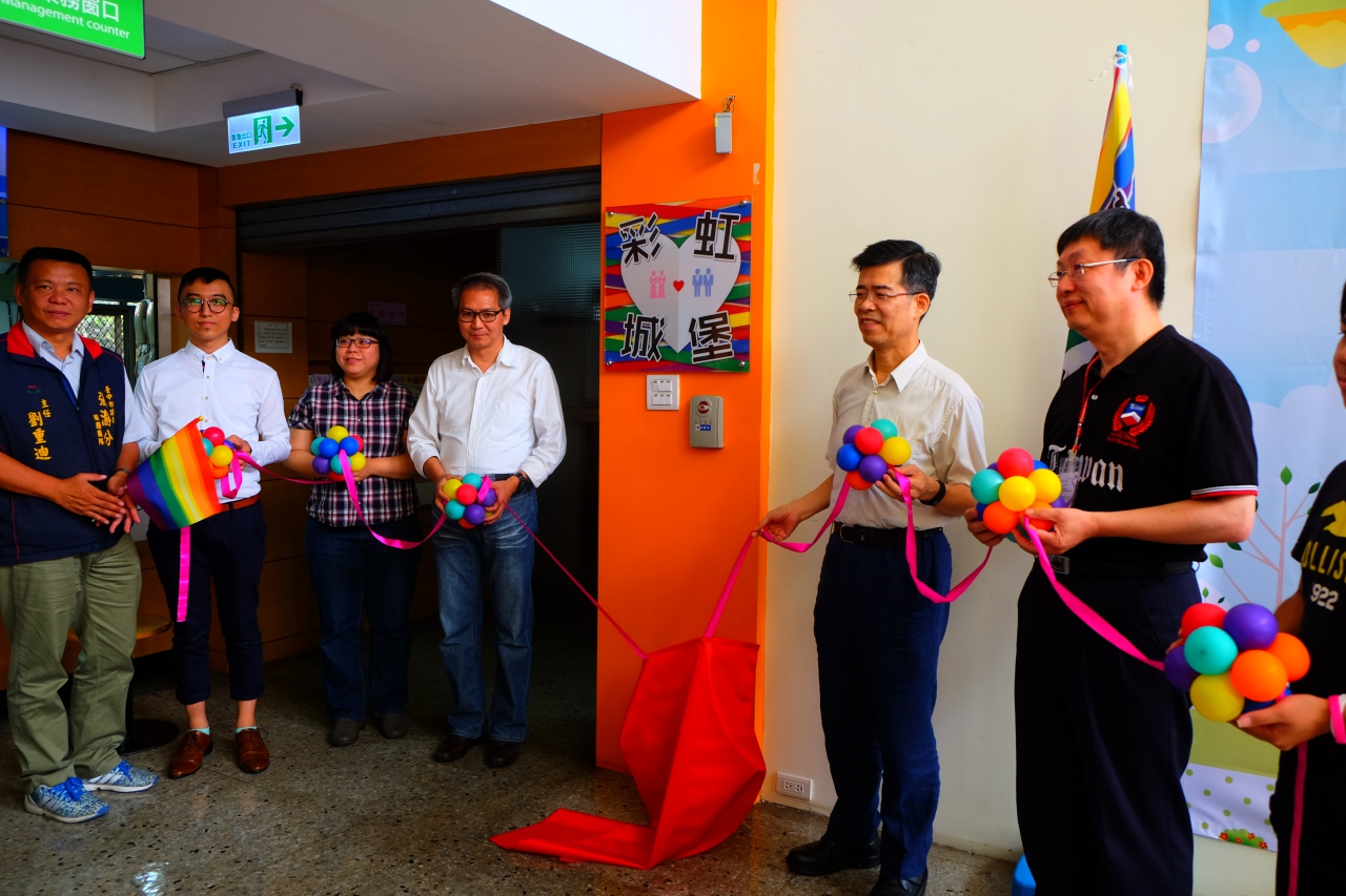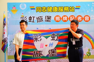 由市府籌設的「彩虹城堡」,是台中市第1家由公部門成立的同志健康社區服務站,近日已設置完畢,今天在市府衛生局1樓大廳舉行揭牌儀式,由衛生局長徐永年、疾病管制署中區管制中心主任林明誠、指揮官王任賢、台灣露德協會主任古佳蓓、台灣基地協會館長林書帆與中部學生性別社團聯盟代表范永樂共同揭牌。