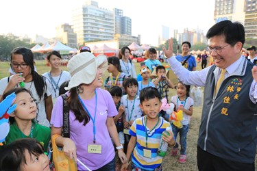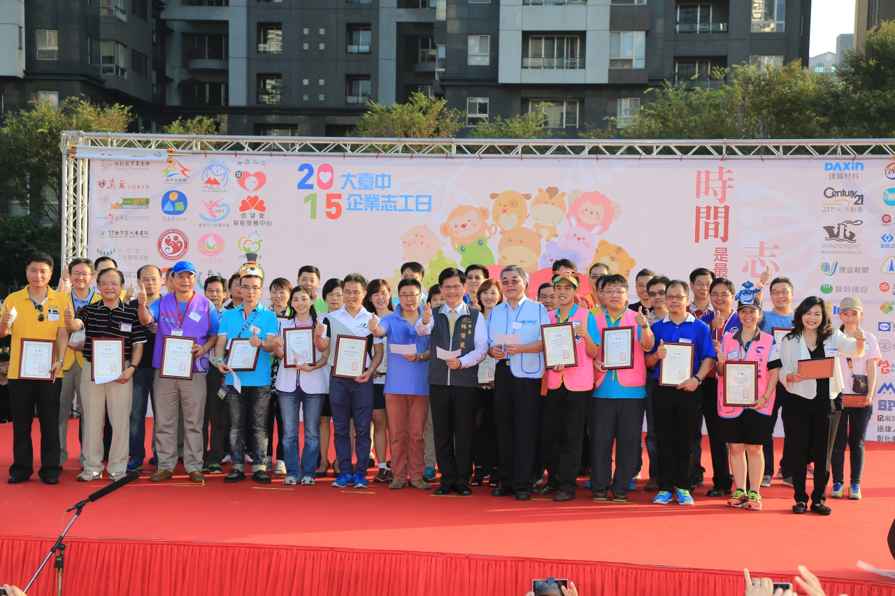 林市長感謝43家企業與36個公益團體帶頭響應「2015大台中企業志工日」,更感謝拓凱基金會董事長沈文振的登高一呼。