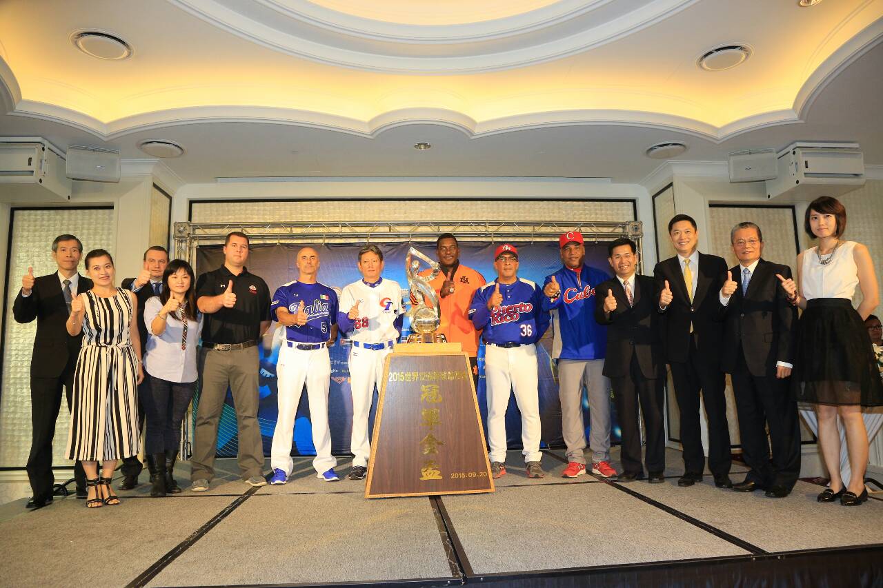 由世界棒總協會(WBSC)舉辦的「2015第1屆世界12強棒球錦標賽」賽前記者會,今(8)日在林酒店展開,由台灣隊專屬加油團「謝京穎&爆女郎」帶來精彩的啦啦隊表演。包括國際棒球總會執行長Micheal Schmidt、潘副市長、中華棒協秘書長林宗成、台中棒委會主委張廖萬堅及中華隊總教練郭泰源和荷蘭隊、義大利隊、加拿大隊、古巴隊、波多黎各隊等總教練與代表出席,並一同圍繞冠軍金盃,宣告第1屆世界12強棒球錦標賽正式展開。