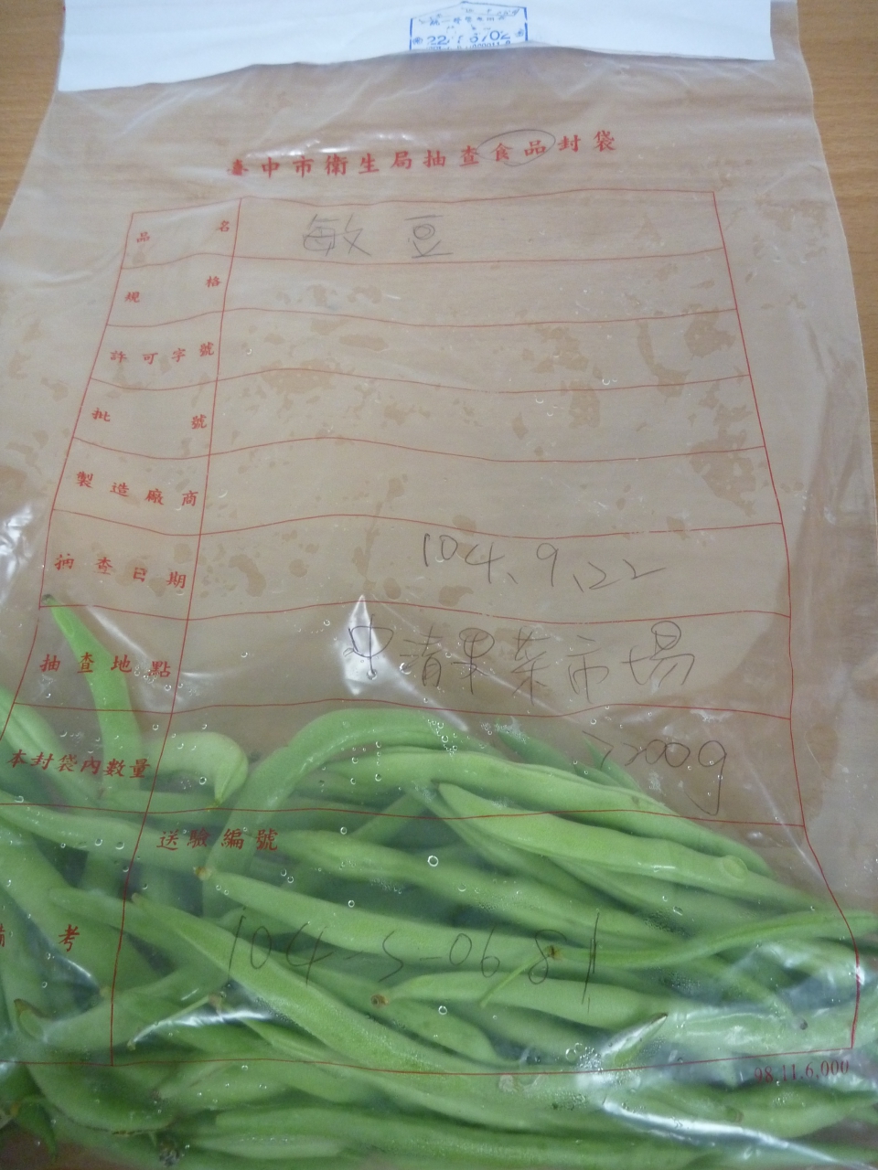 在團膳食材方面,共抽驗食米、蔬果、加工食品、肉品、乳品、水產等各類食材124件,檢驗結果共有74件符合規定、48件檢驗中、2件農藥殘留不符合規定。衛生局指出,2件農藥殘留不合格蔬果是抽驗自台中果菜運銷股份有限公司的「包心白菜」,檢出「賽氟滅(Thifluzamide)0.02ppm」及「敏豆」檢出「滅達樂(Metalaxyl)0.15ppm」【標準:均不得檢出】,衛生局已通知教育局並請源頭管理單位嘉義縣衛生局、南投縣政府衛生局繼續調查辦理。