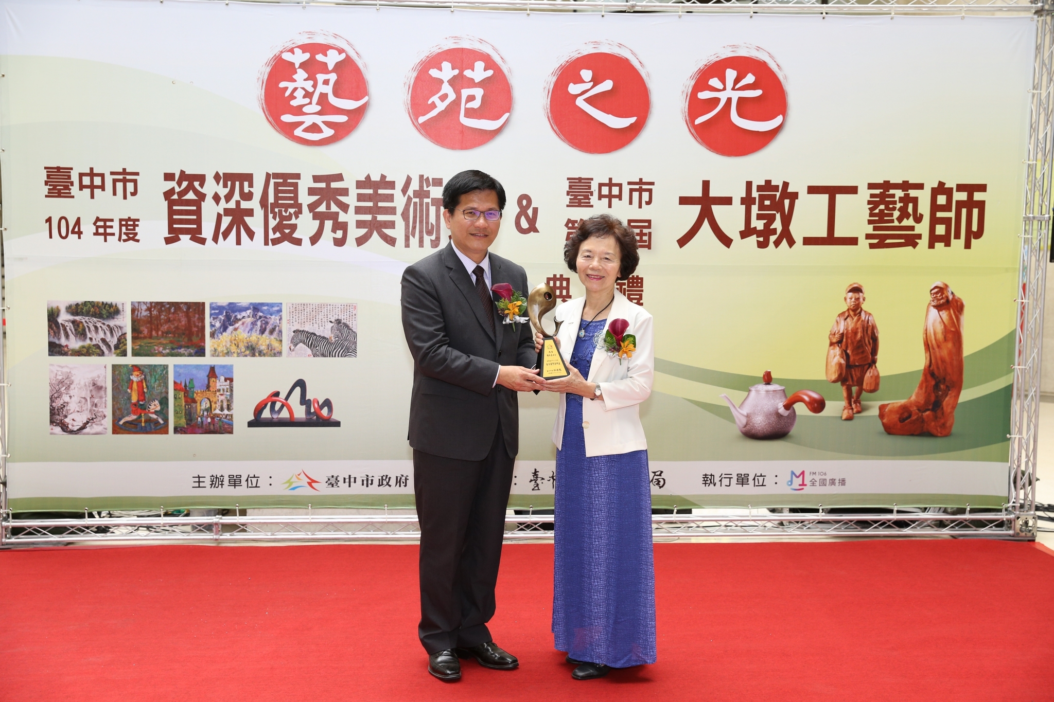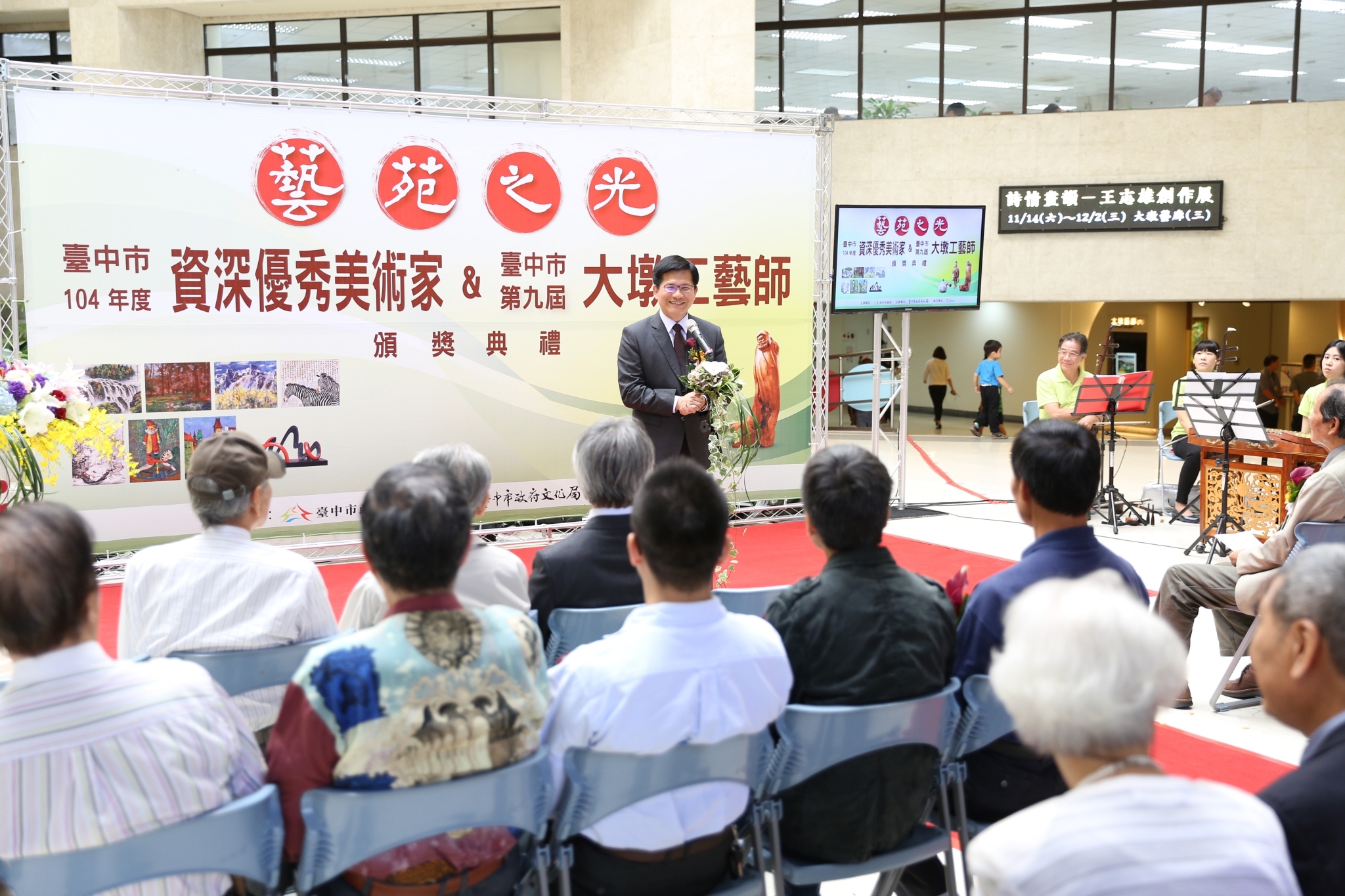 頒獎典禮今日在大墩文化中心舉行,文化局邀請8位資深優秀美術家及3位大墩工藝師提供菁華作品,即日起至12月2日在大墩文化中心舉辦一場極致典雅的美展。
