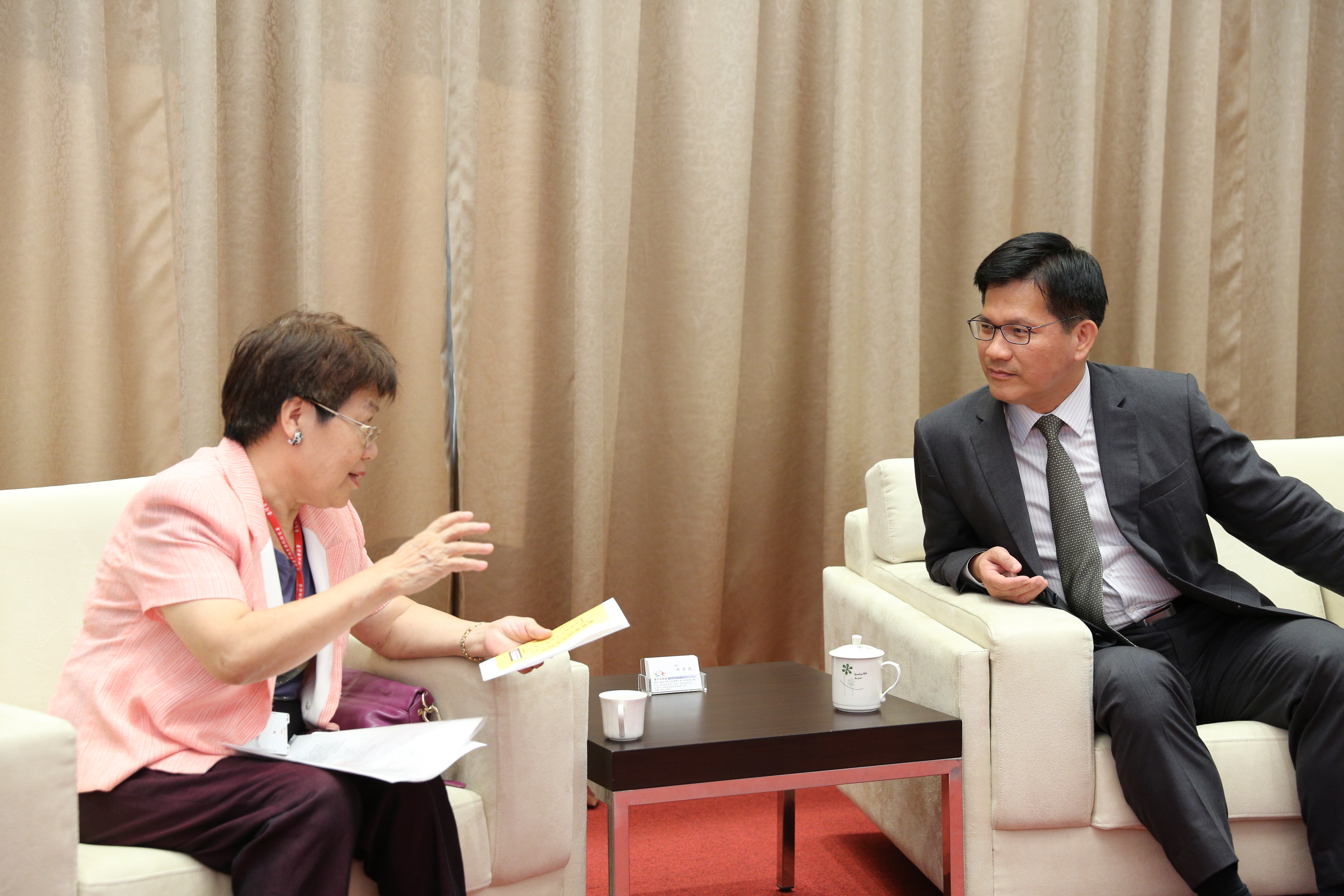 下屆總統與立法委員選舉將於明年1月16日投票,台中地檢署檢察長楊秀美與襄閱主任檢察官洪家原等人,昨(16)日下午到市府拜會市長林佳龍,商討這次大選的反賄選事宜,市府副市長潘文忠、警察局長蔡義猛、民政局長蔡世寅、法制局長陳朝建等人也陪同出席。