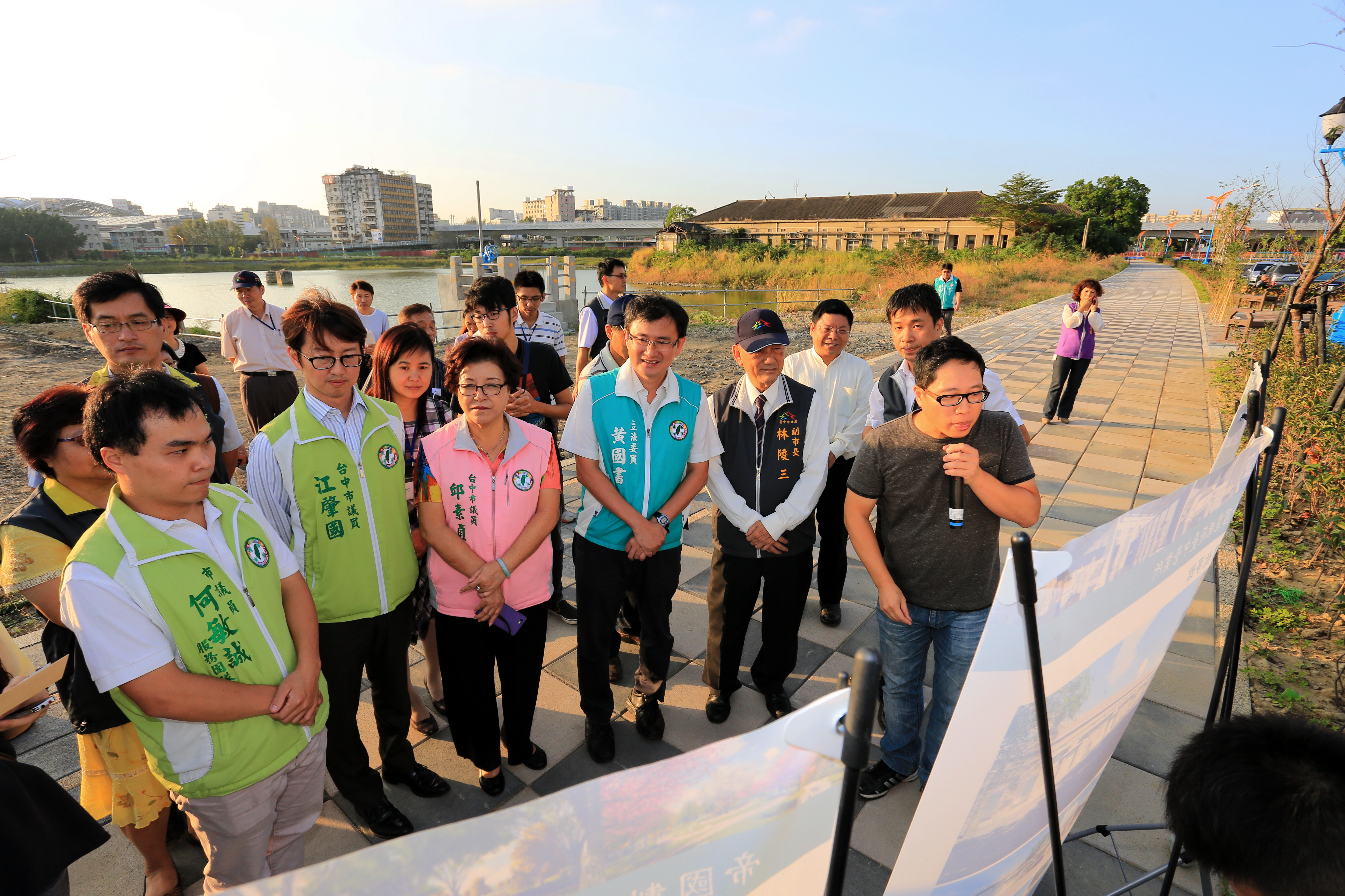 台中市文化資產處今(23)日邀集都市發展局、地政局、經濟發展局、研究發展考核委員會等相關局處前往會勘,副市長林陵三、地政局副局長吳存金、文資處代理處長黃明亨、東區區長江惠雯、立法委員黃國書、市議員何敏誠、邱素貞、鄭功進、江肇國、東區泉源里長羅文甫等人皆到場關心該廠區未來規劃情形,並由建築師謝文泰進行簡報說明。