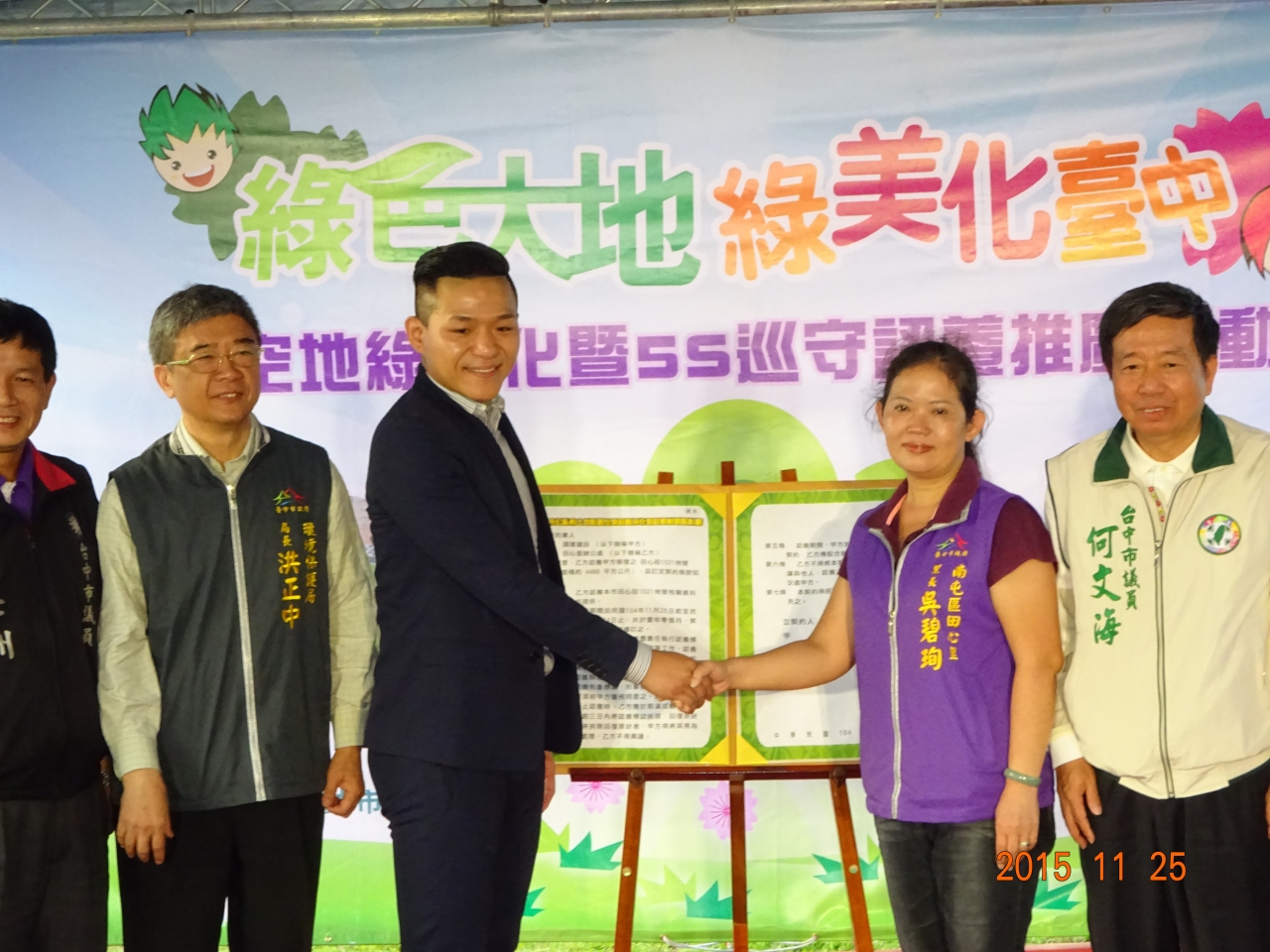 「台中市空地管理自治條例」10月5日獲市議會支持通過,將利用閒置荒廢的公私有空地,打造為人人能享用的空間;台中市政府今(25)日在南屯路口國雄建設自主綠美化土地辦理「空地綠美化暨5S巡守認養推廣」活動,鼓勵企業團體投入認養行列,促進土地充分利用,讓台中成為美麗的花園城市。
