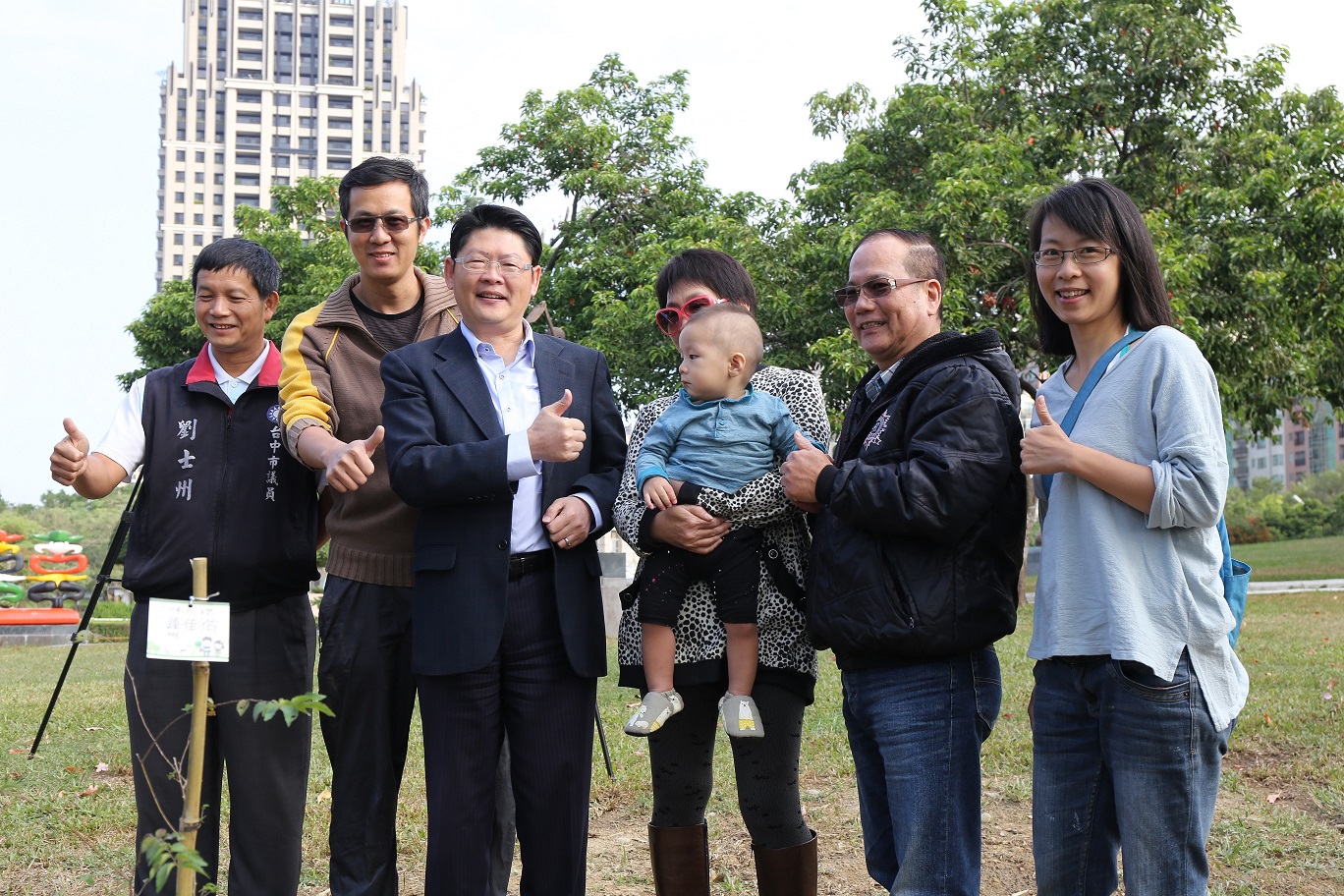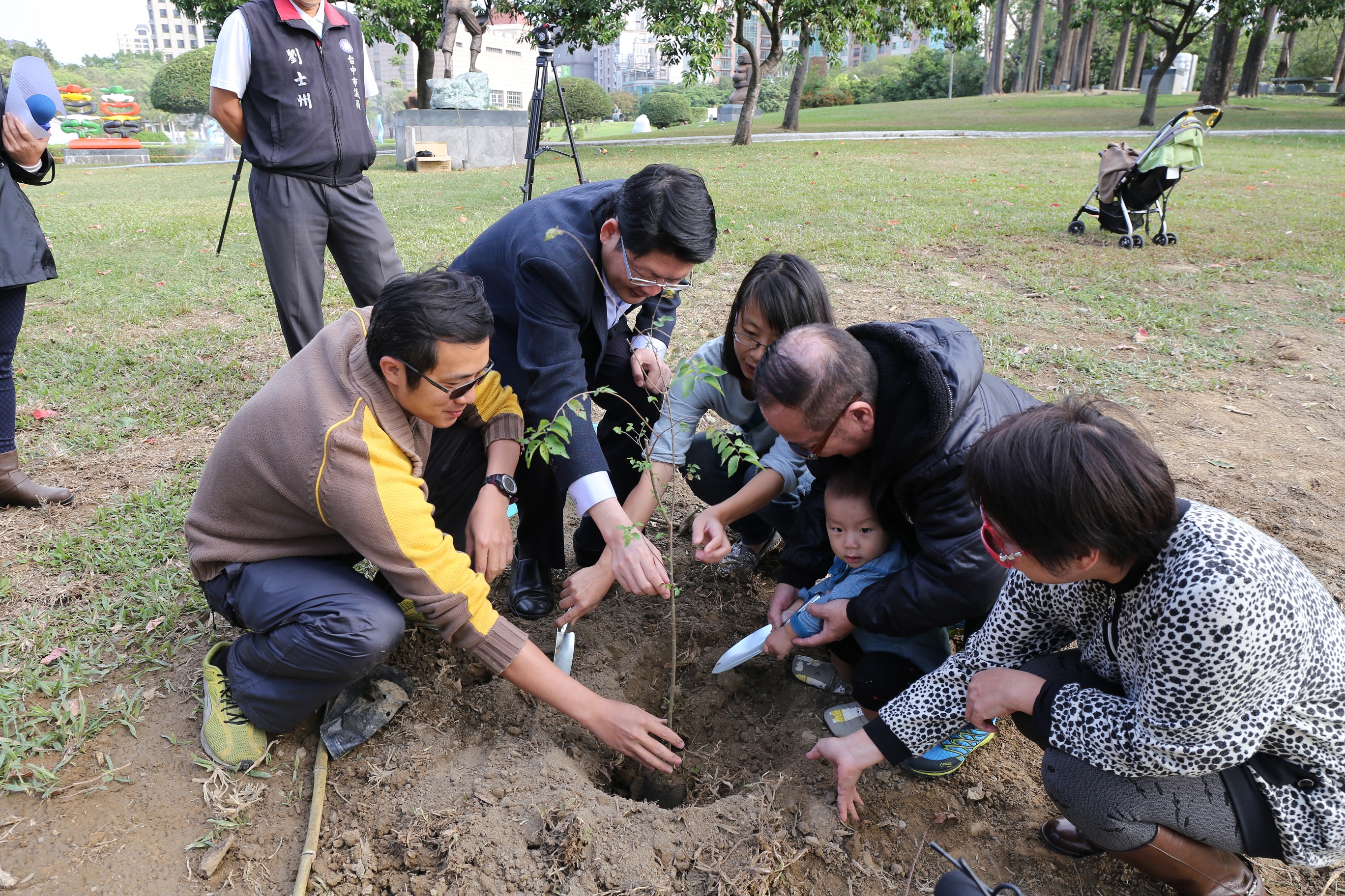 不到1個月,建設局同仁在鍾媽媽、鍾小弟住家附近的豐樂公園,找到一塊可以種樹的土地,並準備台灣櫸幼苗與種樹的工具。今日上午在建設局長黃玉霖、市議員劉士州等人的見證下,由鍾媽媽、鍾爸爸、爺爺、奶奶帶著1歲的鍾小弟,拿起鏟子挖土、澆水,種下生平第1棵樹。