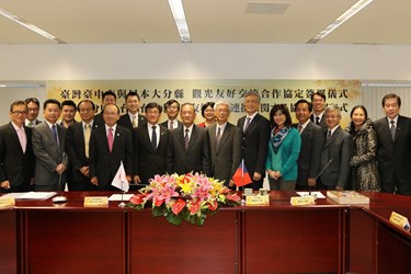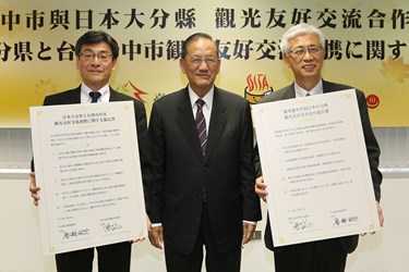 雙方的簽約儀式於今日下午在台中市政府台灣大道市政大樓舉行,在副市長林陵三與台中市各觀光產業代表的見證之下,由觀光旅遊局長陳盛山與大分縣政府企劃振興部長廣瀨祐宏代表雙方政府簽屬協定,會後林副市長也致贈琉璃飾品做為紀念品,而大分縣也回贈當地特產香菇與精美的陶器杯組。