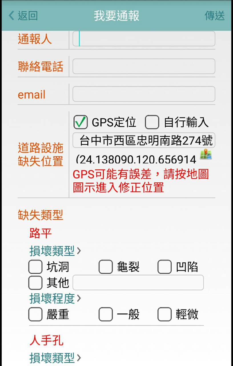 建設局表示,只要上市府網站,下載「臺中好好行」APP,或透過App Store或上網Google Play免費下載,就能取得並使用該項應用程式。民眾在路上若看見「燈不亮、路不平」等狀況,可點選「臺中好路」,進入「案件通報」,就能利用手機GPS座標標示缺失地點、上傳照片或影片,選取有關「路平」、「人手孔」、「水溝通」等,依照缺失類型及損壞程度輸入描述,並且現場拍照上傳照片,並輸入通報人姓名、email及連絡電話,即可完成通報。