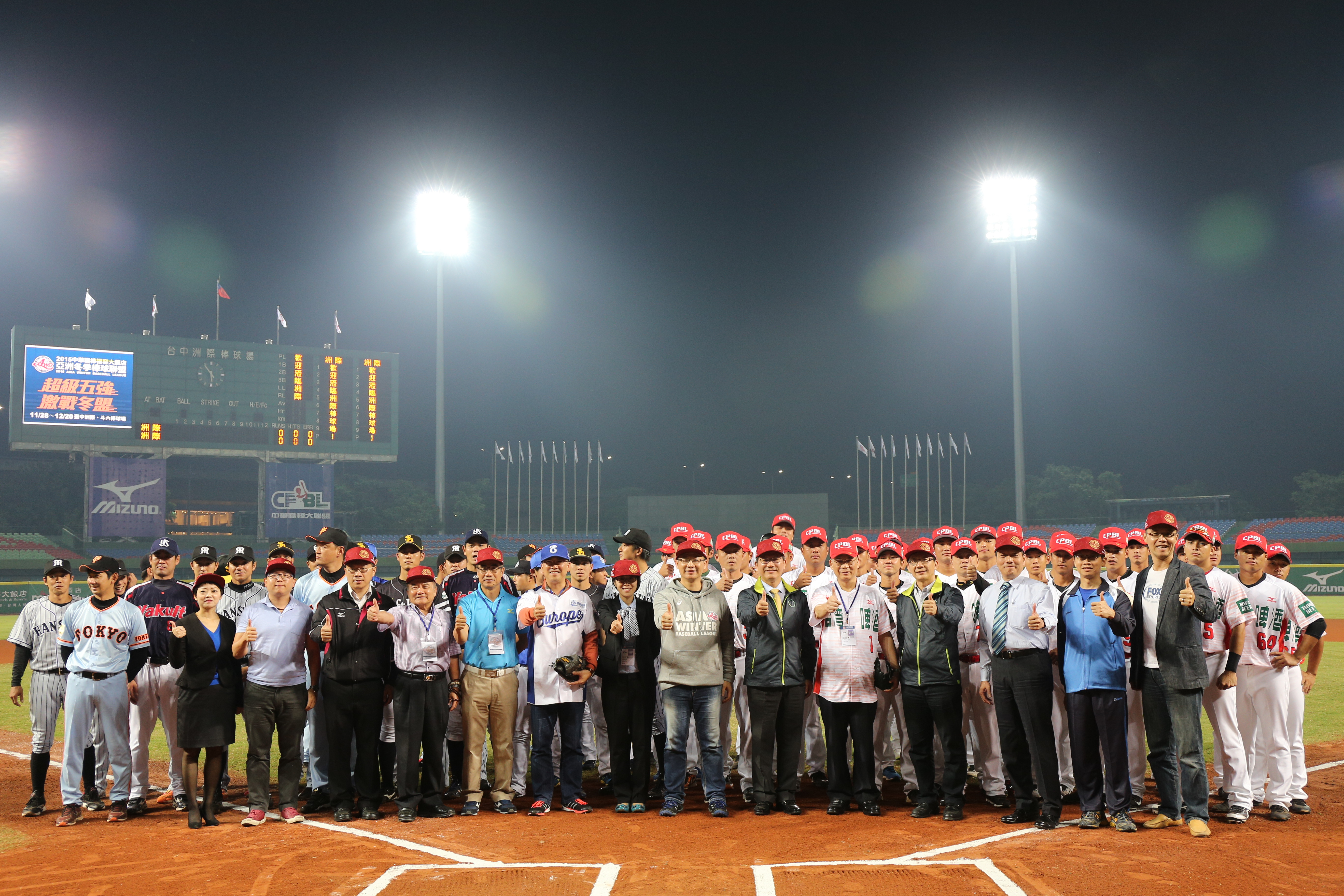 吳志揚會長則說,今晚先由中職聯隊對上日職聯隊,比賽過程由FOX福斯體育台全程轉播,接下來還有40多場賽事,期望藉由比賽,為台灣棒球再塑造明日之星,也祝福所有的球迷們看球愉快。