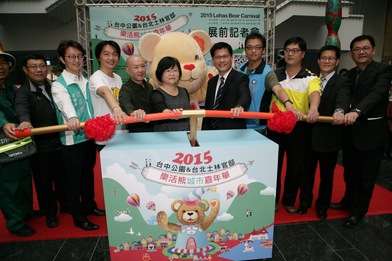 台中市政府經發局今(2)日在台灣大道市政大樓舉辦「2015樂活熊城市嘉年華」活動記者會,由林市長、市議員江肇國、泰迪熊協會理事長林要任等人一同為活動揭開序幕,現場也展示包括產業4.0熊、九天民俗技藝團熊、小獅王辛巴熊等12座新熊座,可愛萌樣吸引民眾爭相合照。