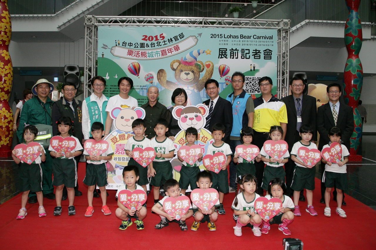 林市長表示,今年泰迪熊嘉年華以「愛‧分享」為主題,象徵人在悲傷時,泰迪熊可當傾訴的對象,也為人們帶來快樂,把愛分享出去;今年活動辦在台中公園,除了有益活化中區,更為舊市區帶來歡樂,期望吸引更多人到中區來。