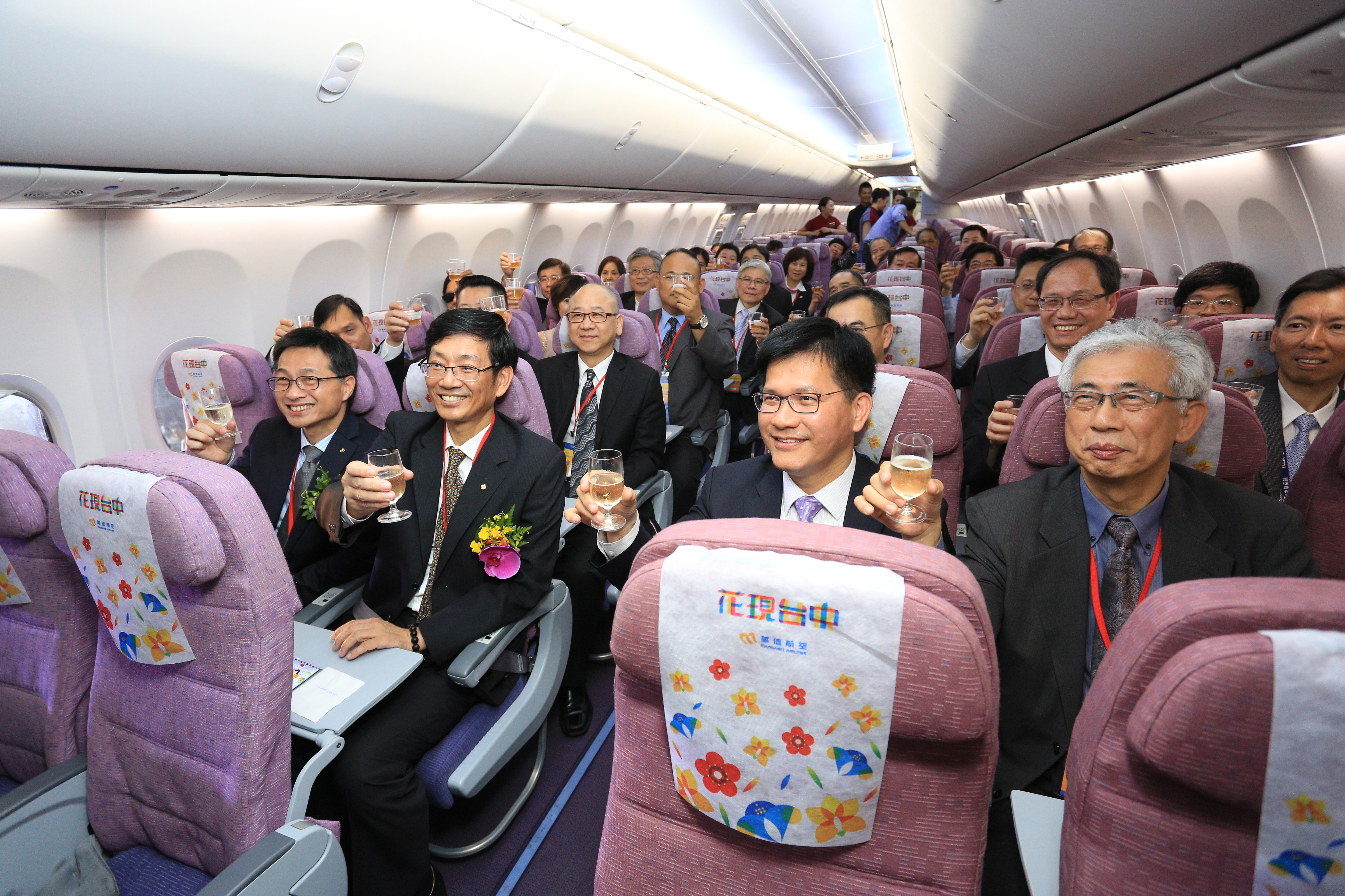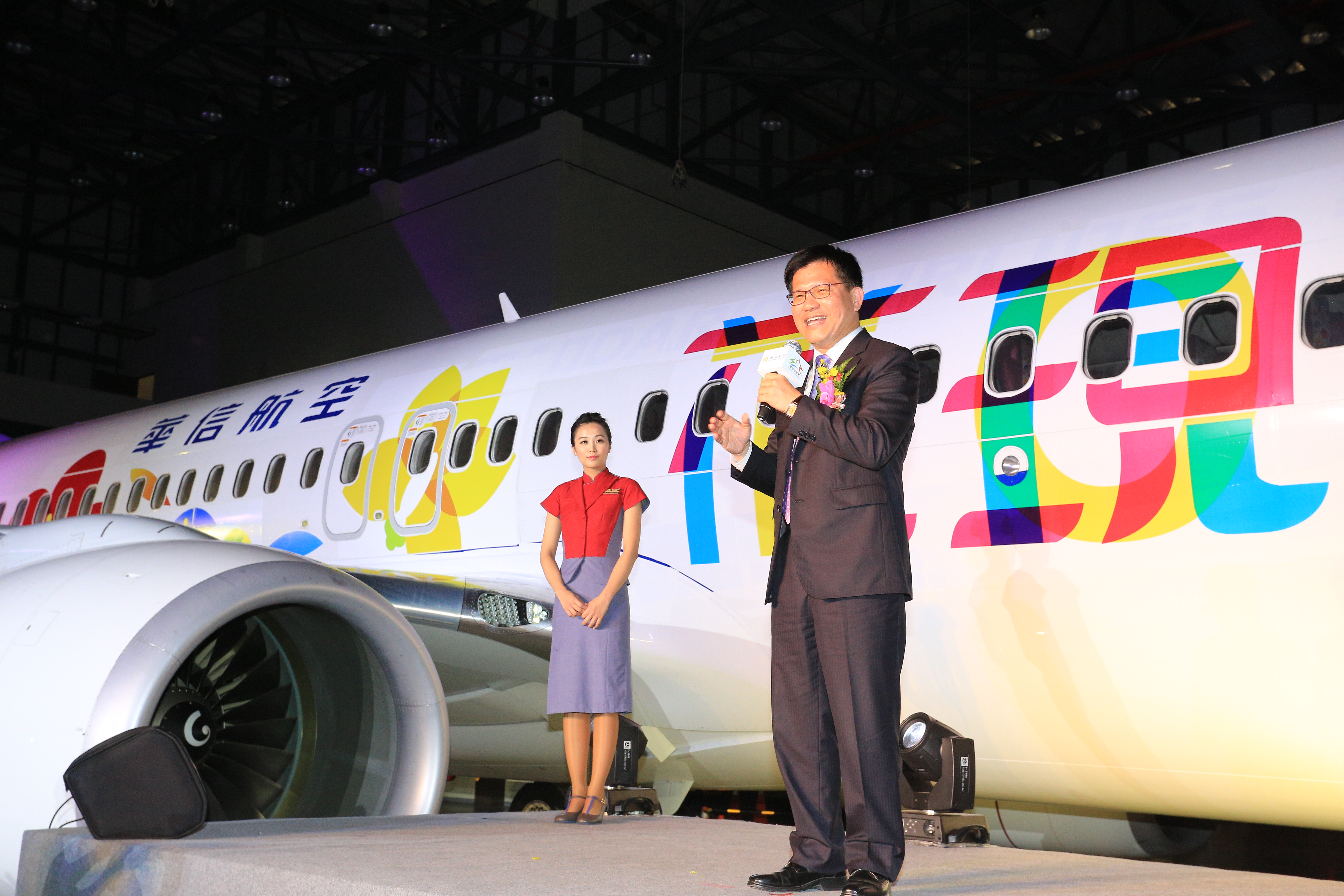 華信航空張董事長指出,「花現台中」彩繪機是以華信航空今年9月由美國波音公司全新出廠的B737-800型客機塗裝,飛機編號為B-18659,共8席商務艙、153席經濟艙,機身使用3M獨步全球貼紙彩繪,將於明日上午8時55分由台中首航香港,代言台中觀光旅遊,並提升台中的國際知名度與能見度。