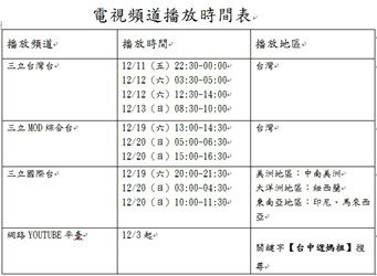為讓更多民眾觀賞「台中迓媽祖」紀錄片,即日起在網路YOUTUBE平台隨時選播,自12月11日起並在三立台灣台及三立MOD綜合台陸續播放;另外,12月19日起也將在中南美洲、紐西蘭、印尼、馬來西亞播映的三立國際台播放,詳細播放時間表請見附圖。(12/3*13)*文化局