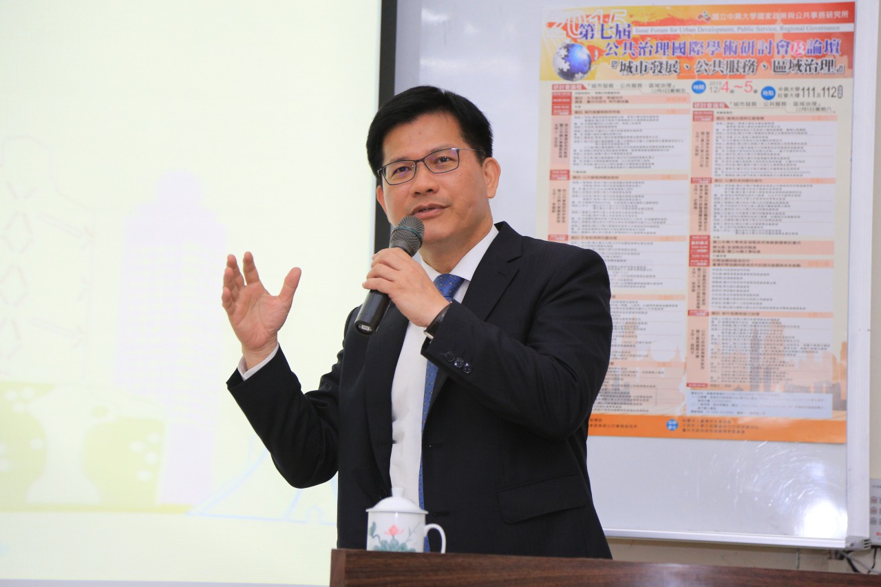林市長今日受邀至國立中興大學參與「2015第七屆公共治理國際學術研討會及論壇」,以「城市發展、公共服務、區域治理」為主題進行演講。他表示,政府治理應先回探討為何人們喜歡到好的城市發展?因此治理必須貼近人民所需,落實在人民生活的每個層面,找到城市的定位,發展城市獨特性。而城市發展最重要的兩個要項就是「基礎建設」及「人的質量」,因此,台中發展以「人本、永續、活力」為理念,希望打造為生活首都。