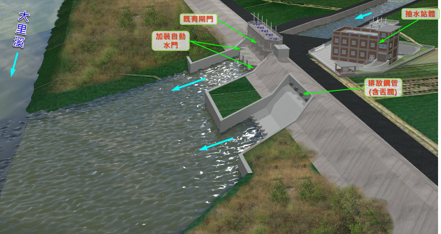 水利局表示,未來暴雨期間大里溪水位高漲時,抽水站可協助降低排水水位,再藉由抽水機組動力抽排至大里溪,以改善此區淹水災情。(12/4*13)*水利局