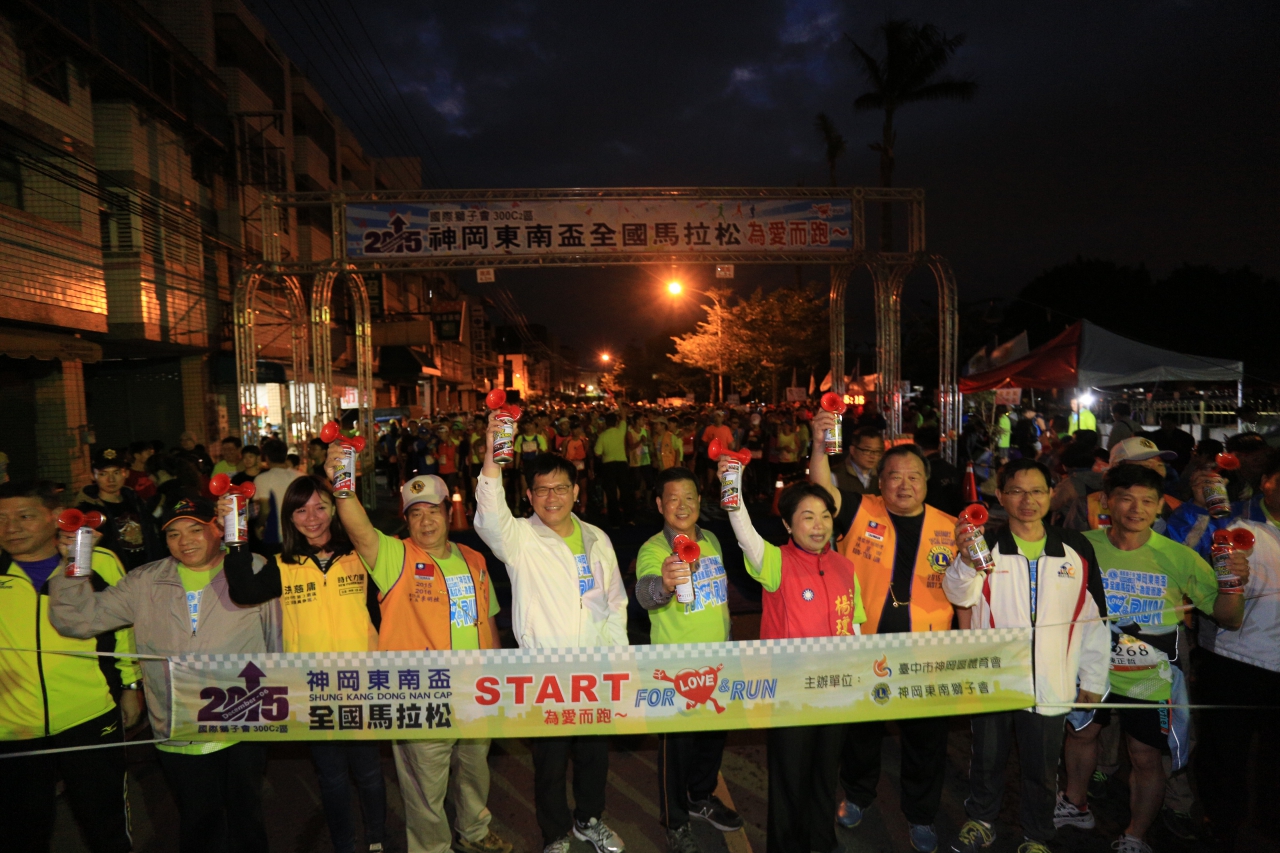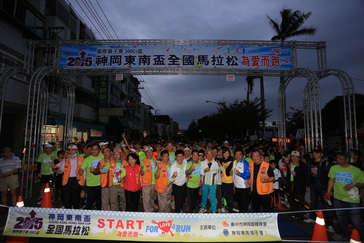 今日路跑由神岡區體育會、國際獅子會300C2區神岡東南獅子會主辦,有42.195K、21K、10.6K及4.8K等4個組別,在林市長、民政局長蔡世寅、體育處長郭明洲、參議王岳彬、市議員陳清龍、神岡區體育會理事長宋逢吉、神岡東南獅子會長李明桂等人的鳴槍加油聲中,4000多名跑者從神岡國小出發,沿著潭雅神綠園道奔跑;林市長也在路旁與跑者擊掌,為他們加油打氣,跑者也報以熱情回應,氣氛熱烈。