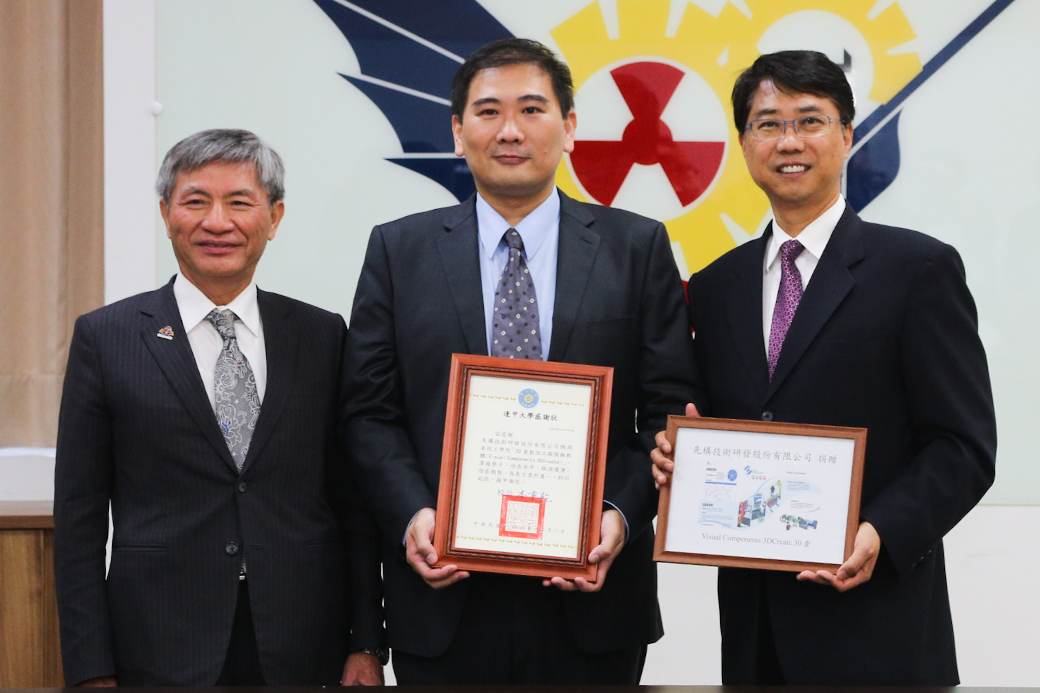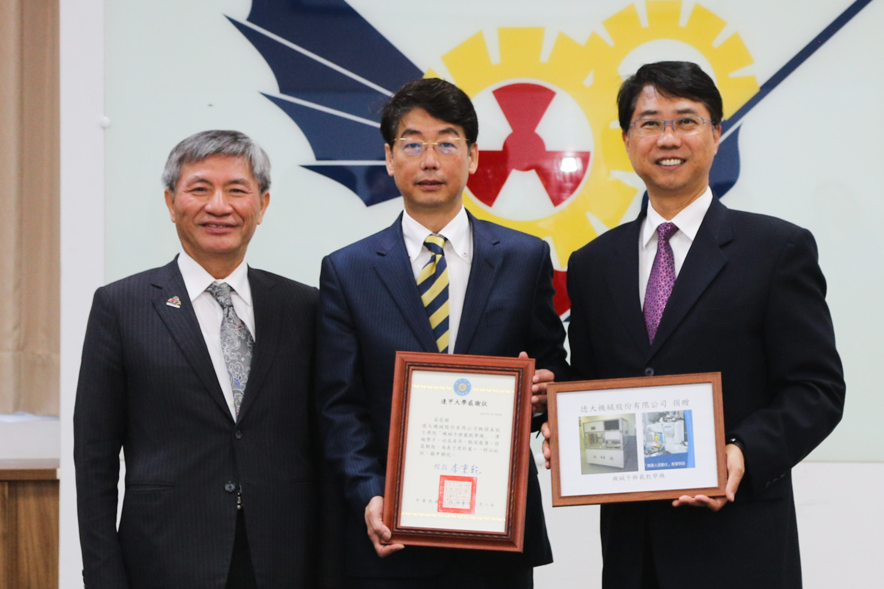 今天的捐贈儀式由德大機械公司總經理黃耀德、先構技術研發公司總經理陳昱均代表捐贈機械手移載教學機及30套數位工廠模擬軟體Visual Components 3D Create給逢甲大學校長李秉乾,李校長也回贈兩家企業感謝狀;包括張副市長、工業技術研究院中分院智慧化工具機技術中心副主任羅佐良、台中市潭雅神工業廠商協進會總幹事陳政鴻及多位企業代表,都到場觀禮見證。