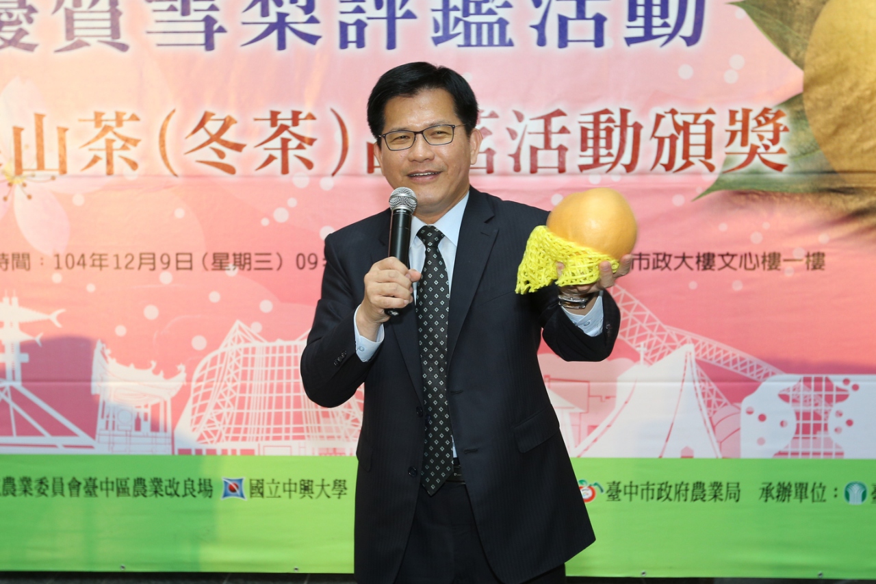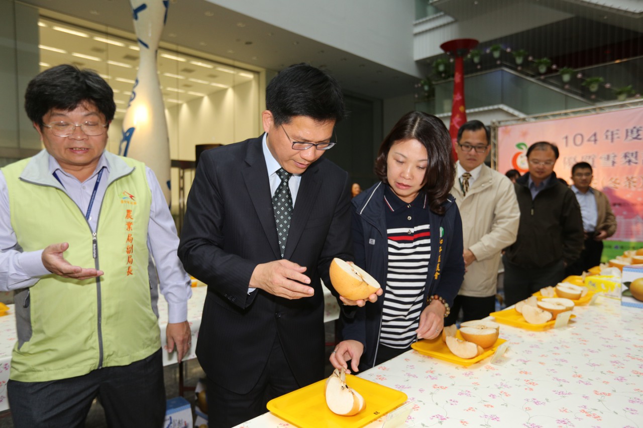 台中市政府農業局舉辦的評鑑及頒獎活動於台灣大道市政大樓舉行,雪梨評鑑共有68組產銷班農民參加,經由評審仔細品嘗觀察後,最後選出前三名得獎者;至於梨山茶日前已完成評鑑,並選出12組五星獎梨山茶,今日再由林市長頒獎鼓勵。林市長現場品嘗雪梨及梨山茶,讚不絕口,農業局副局長蔡勇勝、和平區農會理事長王結利、總幹事鄧碧珠等人皆共襄盛舉。