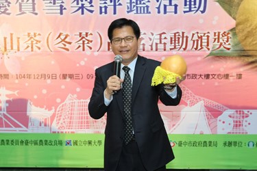 台中市優質雪梨及梨山茶評鑑頒獎活動今(9)日舉行,雪梨評鑑由林金全榮獲第一名,成為今年度雪梨達人,梨山茶則由汪得郎等人獲得五星獎,由市長林佳龍頒獎表揚,推廣優質茶果。林市長表示,透過評鑑、產銷履歷等認證方式,可確保農產品質,讓民眾吃得更安心,也期望將台中優質農產品行銷全世界,讓國際認識台中。