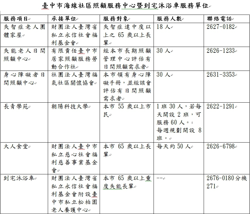 此外,海線社區照顧服務中心詳細服務單位、服務內容、對象、聯絡電話等資訊請見附圖。(12/15*13)*社會局