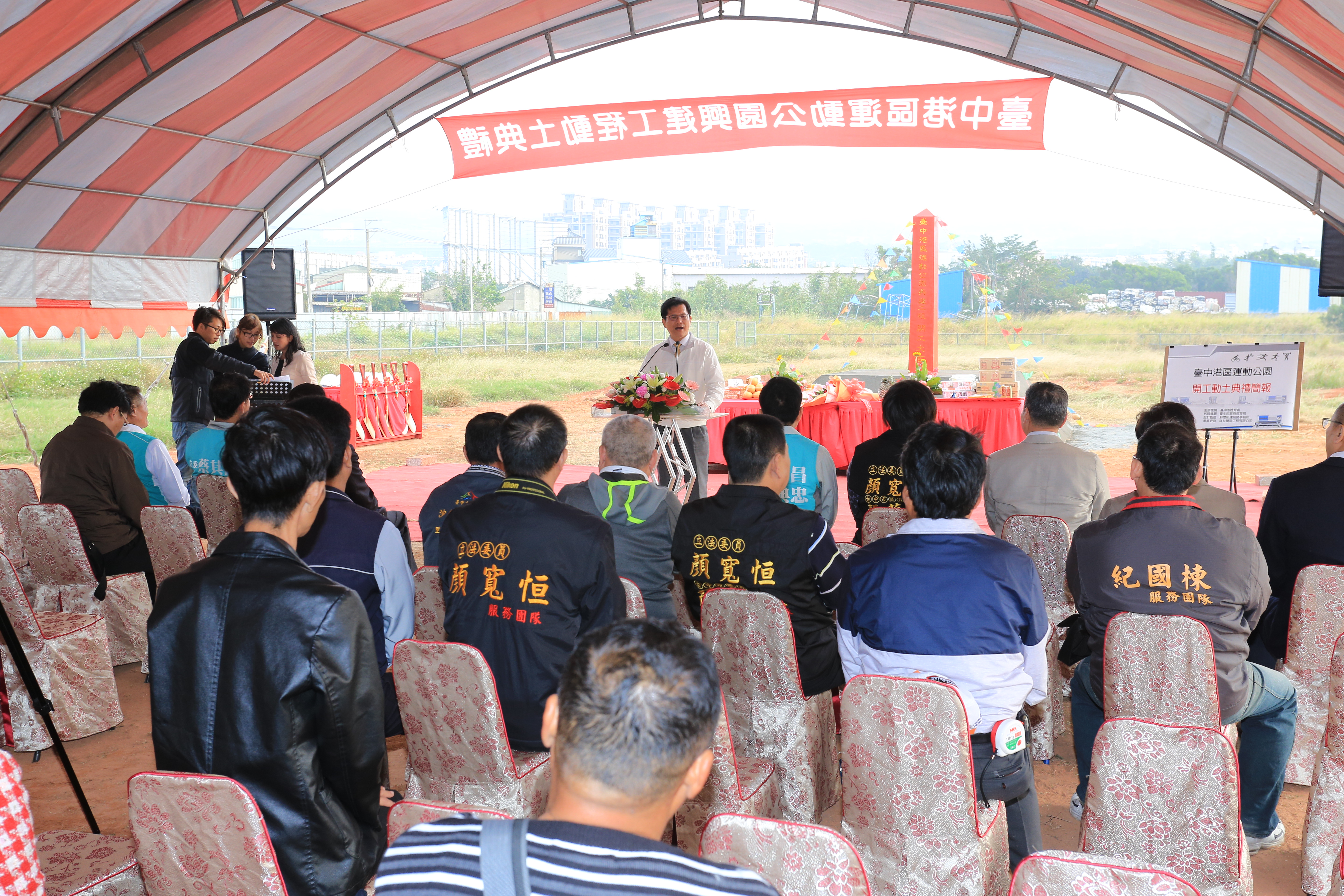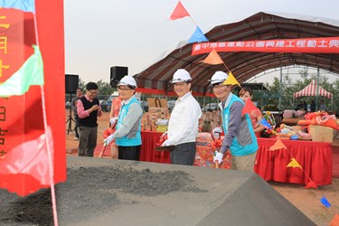 運動公園今日舉行開工動土典禮,先由建築師蘇懋彬簡報園區未來規劃及願景,再由林市長、教育局長顏慶祥、體育處長郭明洲、參議王岳彬、立法委員顏寬恒、市議員楊典忠、王立任、顏莉敏等人持香祭拜後,一同持金鏟動工。