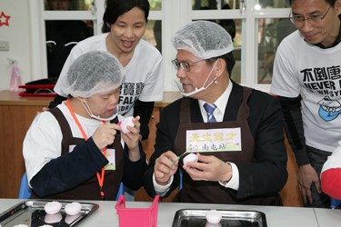 台中市第一家運用特教學校空間設立的身心障礙社區日間作業設施「天生我才台中南屯站」今(17)日開幕啟用,現場先由唐寶寶陶笛隊演奏活潑的「寶島曼波」,搭配扭腰擺臀的逗趣表演,讓寒冷的天候都溫暖起來;隨後由林市長與唐寶寶們一同製作手工皂,「先轉一轉,再刮一刮」林市長也在唐寶寶的指導下完成了修皂工作,氣氛溫馨,笑聲不斷。
