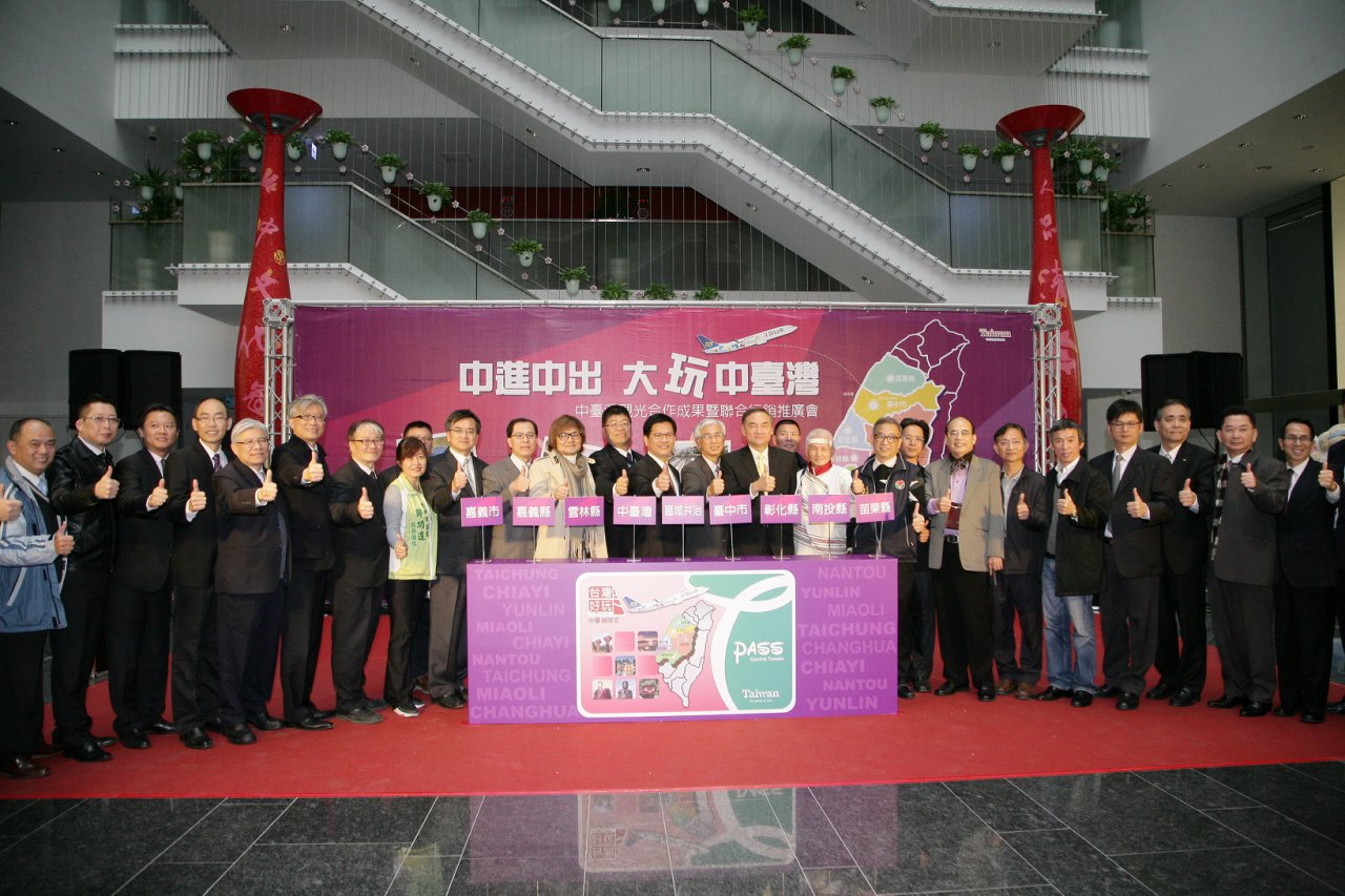 市府觀光旅遊局今(17)日在台灣大道市政大樓舉辦「中臺灣觀光合作成果暨聯合行銷推廣」記者會,包括台中市長林佳龍、觀光旅遊局長陳盛山、彰化縣副縣長周志中、苗栗縣國際文化觀光局長邱蓬新、南投縣政府觀光處長王源鍾、雲林縣文化處長林源泉、嘉義縣文化觀光局長吳芳銘、嘉義市交通觀光處長鄭君健等7縣市首長、代表,均到場共襄盛舉,宣布明年將合作推動海內外觀光旅遊聯合行銷。