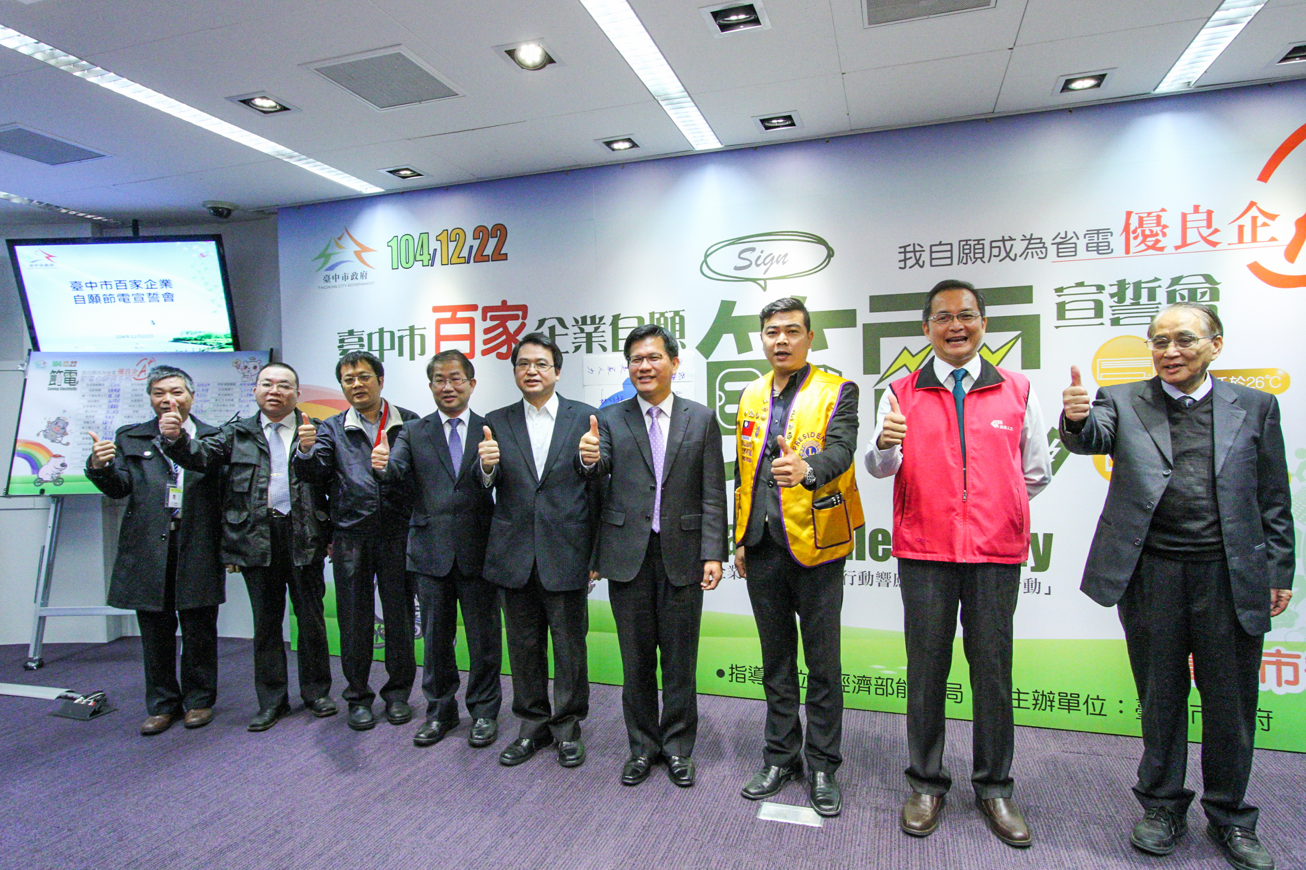 台中市低碳城市推動辦公室今(22)日在台灣大道市政大樓舉行「台中市百家企業自願節電宣誓會」,由林市長與各企業代表簽名共同宣誓節電的決心,並邀請台積電、富邦人壽、國霖機電、威廉赫登保全股份有限公司等分享公司節電措施供大家參考;低碳城市推動辦公室執行長黃崇典也出席共襄盛舉。