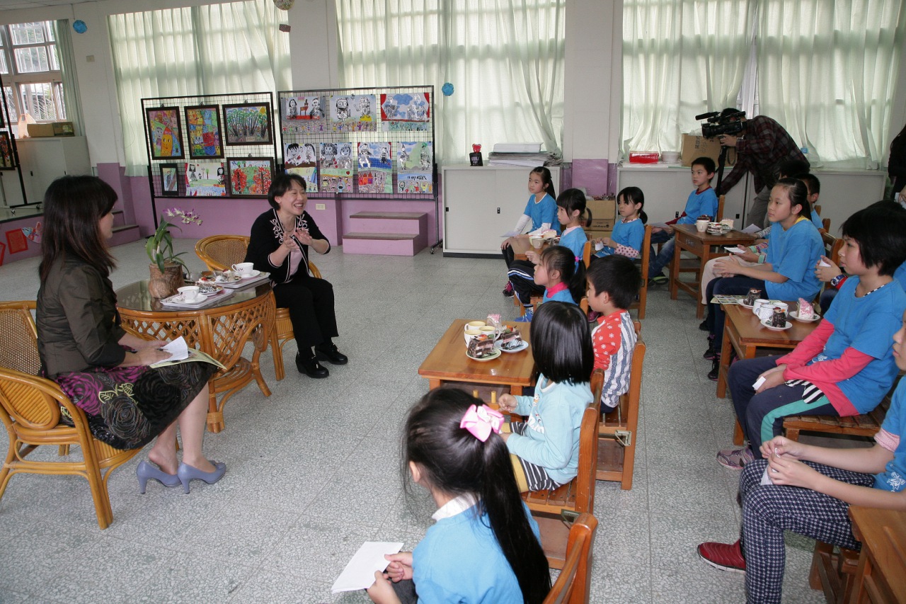 全校師生也與市長夫人共享下午茶,現場有小朋友好奇詢問林市長與市長夫人是怎麼認識的?市長夫人說,她們是在美國耶魯大學相識,當時她正就讀碩士班,林市長則攻讀博士,他們總是在學校裡面的書局裡約會,邊喝咖啡邊看書,待到晚上6點書局打烊後才依依不捨地離開。