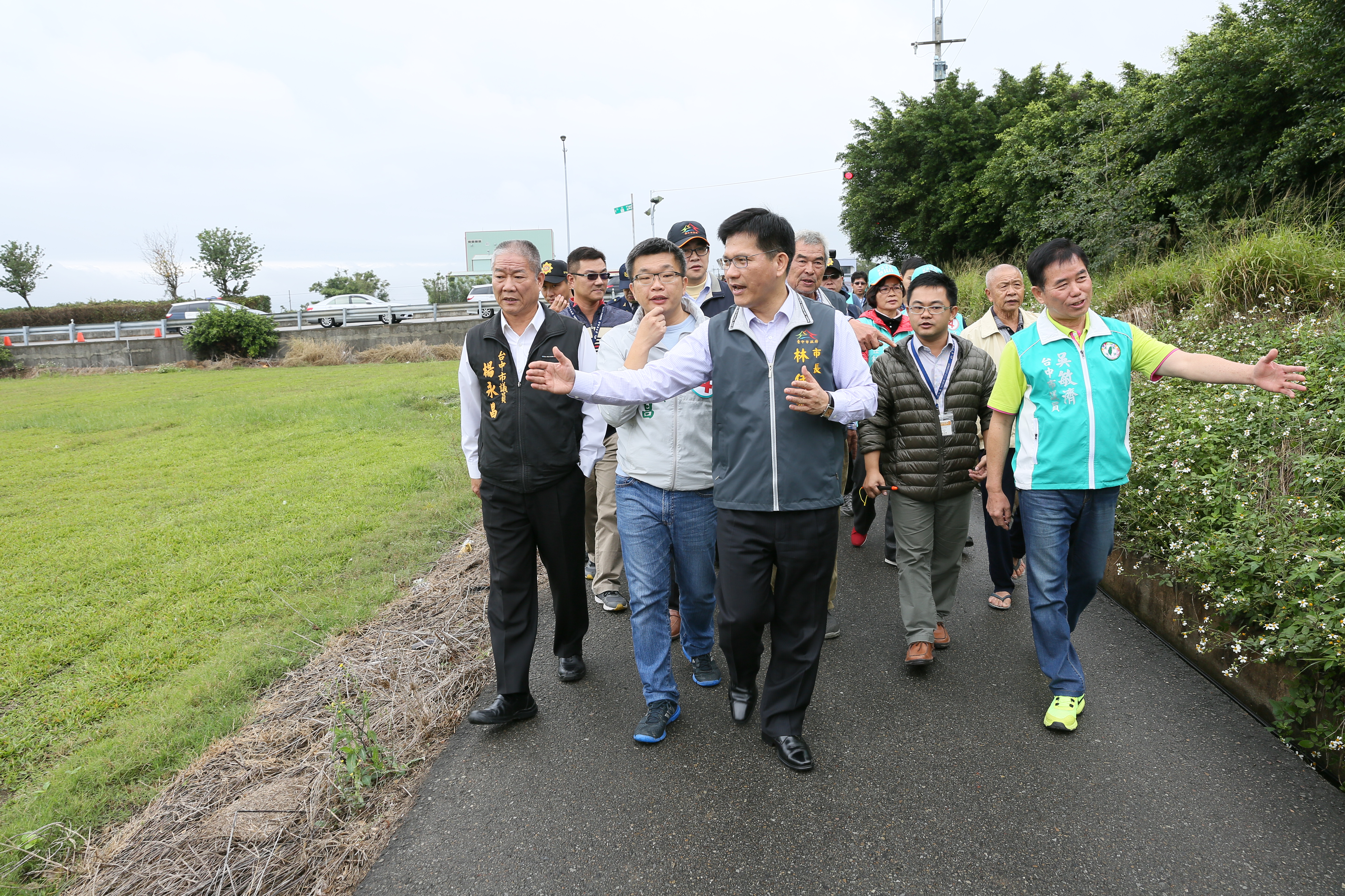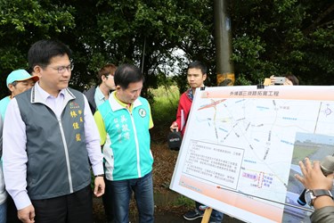 林市長今日在外埔區長卓義騰的陪同下,前往外埔區三崁路視察道路拓寬工程,並聽取建設局簡報,立法委員蔡其昌、市議員吳敏濟,均到場關心。
