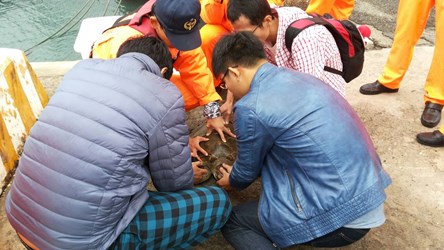 綠蠵龜擱淺梧棲漁港 中市府協助救援 台中市政府農業局今(27)日上午接獲通報,梧棲漁港內發現「綠蠵龜」擱淺,市府、海洋生物博物館、海洋大學、行政院海岸巡防署海岸巡防總局中部地區巡防局第三海岸巡防總隊梧棲漁港安檢所,均派員前往現場救援。 農業局表示,獲救的綠蠵龜長58公分,龜殼邊緣輕微破損,目前健康狀況尚佳,海洋生物博物館已協助運回研究中心做詳細檢查,待傷勢復原後,再安排野放事宜。(12/27*11)*農業局 聯絡人:台中市政府農業局 聯絡電話:04-22289111