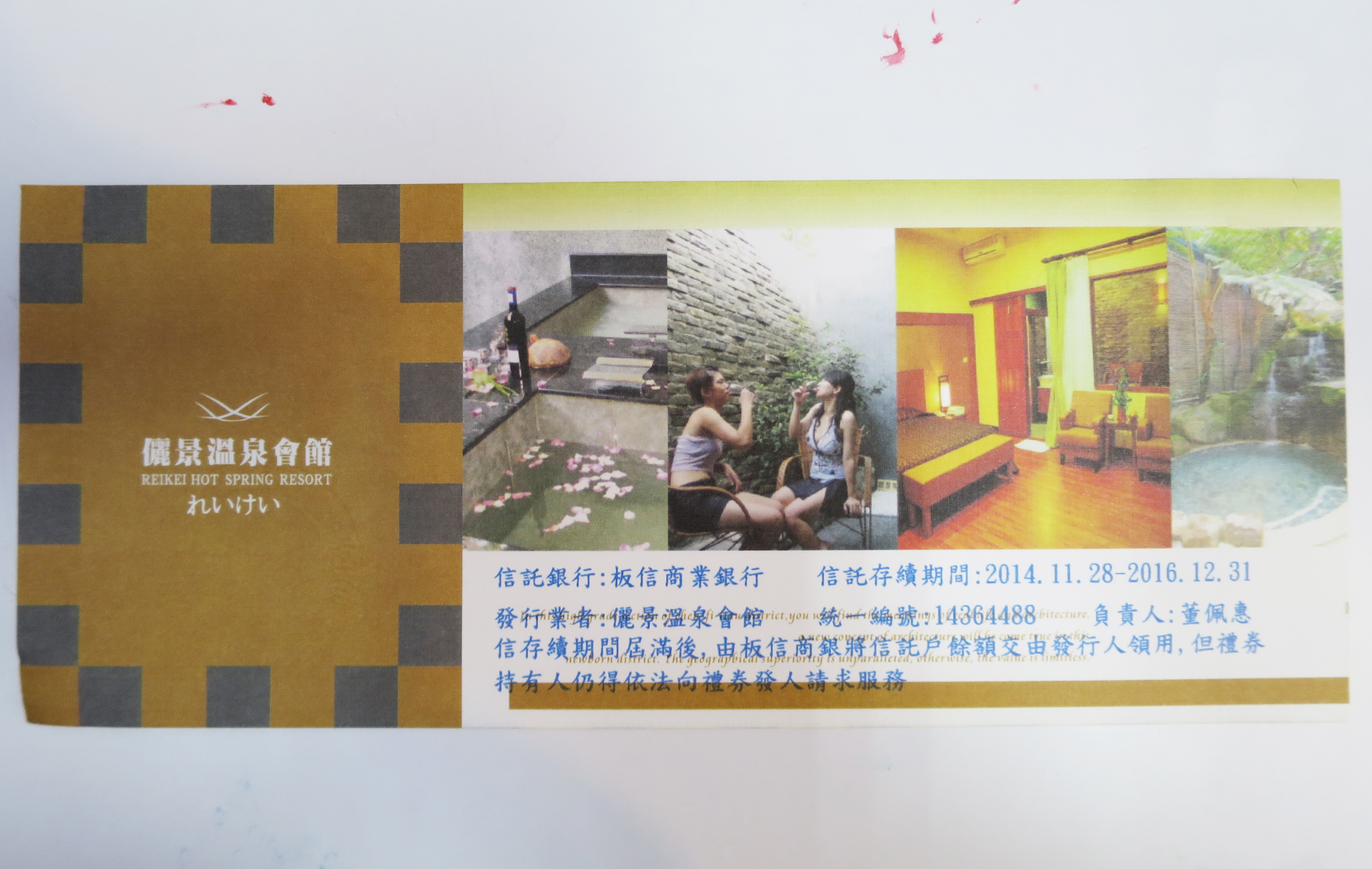 中市消保官日前會同觀光旅遊局、衛生局在旅展會場舉行「禮券健檢」活動,發現消費者所購買的儷景溫泉會館住宿券,雖有板信商業銀行的履約保證記載,但無銀行戳章或防偽標章,經消保官與銀行查證,只有部分儷景溫泉會館禮券曾與板信商銀約定成立信託契約,此次旅展所銷販售禮券並未辦理信託,不在銀行履約保證範圍內。